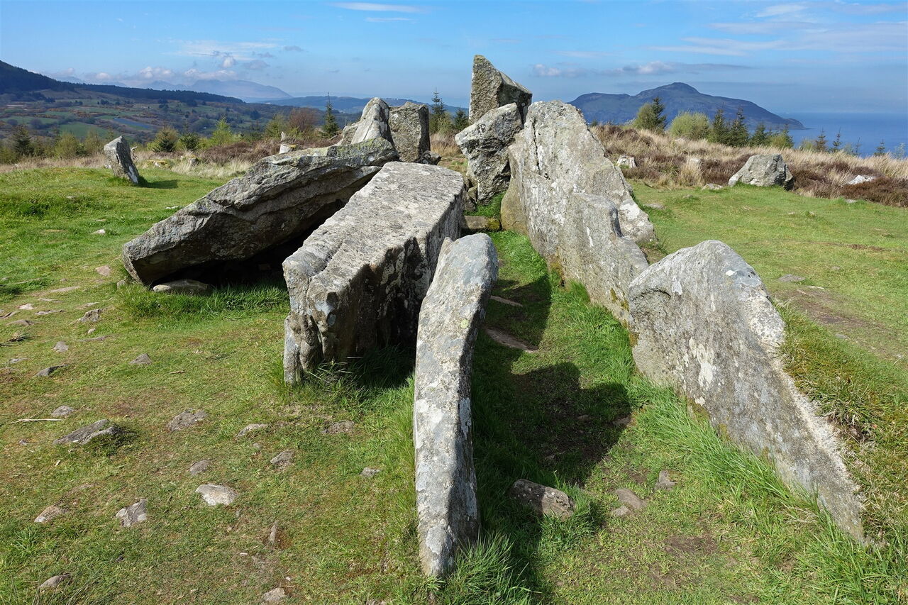 Nach 550 m, wir haben bereits die letzten Häuser hinter uns gelassen, gehen wir links in Serpentinen auf einem angelegten Weg bergauf, bis wir bei einer kleinen Lichtung auf die 02 Giants’ Graves (128 m) und Informationstafeln treffen. Im vorderen Bereich befindet sich eine Megalithanlage und kurz dahinter die Reste einer weiteren Kammer. Bei Ausgrabungen wurden in der hinteren Kammer Feuersteinmesser, zerscherbte Keramik, Pfeilspitzen und verbrannte Knochenreste gefunden.