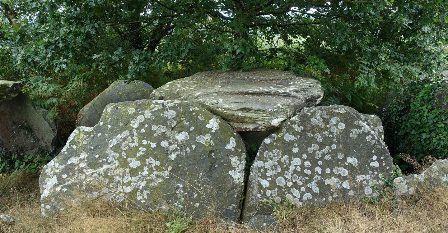 Einen rechten Abzweiger ignorieren wir. Bei einem Holzgatter und einer nachfolgenden Weggabelung gehen wir geradeaus Richtung Gouarec. Kurz später erreichen wir die erste von zwei Megalithanlagen. Die zweite, die 03 allée couverte du Néolithique (246 m), wird auf 5000 bis 2000 Jahre v. Chr. datiert. Wir lassen sie auf der rechten Seite liegen und gehen nun auf einem außergewöhnlichen Höhenweg durch eine beeindruckende Hochmoorlandschaft. Der Pfad führt vorbei an gespenstisch anmutenden Häusern, in denen bereits Bäume ihr Zuhause gefunden haben. Sobald man unterhalb im Tal die ersten Häuser sieht, gabelt sich der Weg, beide Wege führen zum Ziel. Am Parkplatz nahe der Hauptstraße gehen wir scharf rechts, nun wieder leicht bergauf auf einem Hohlweg.