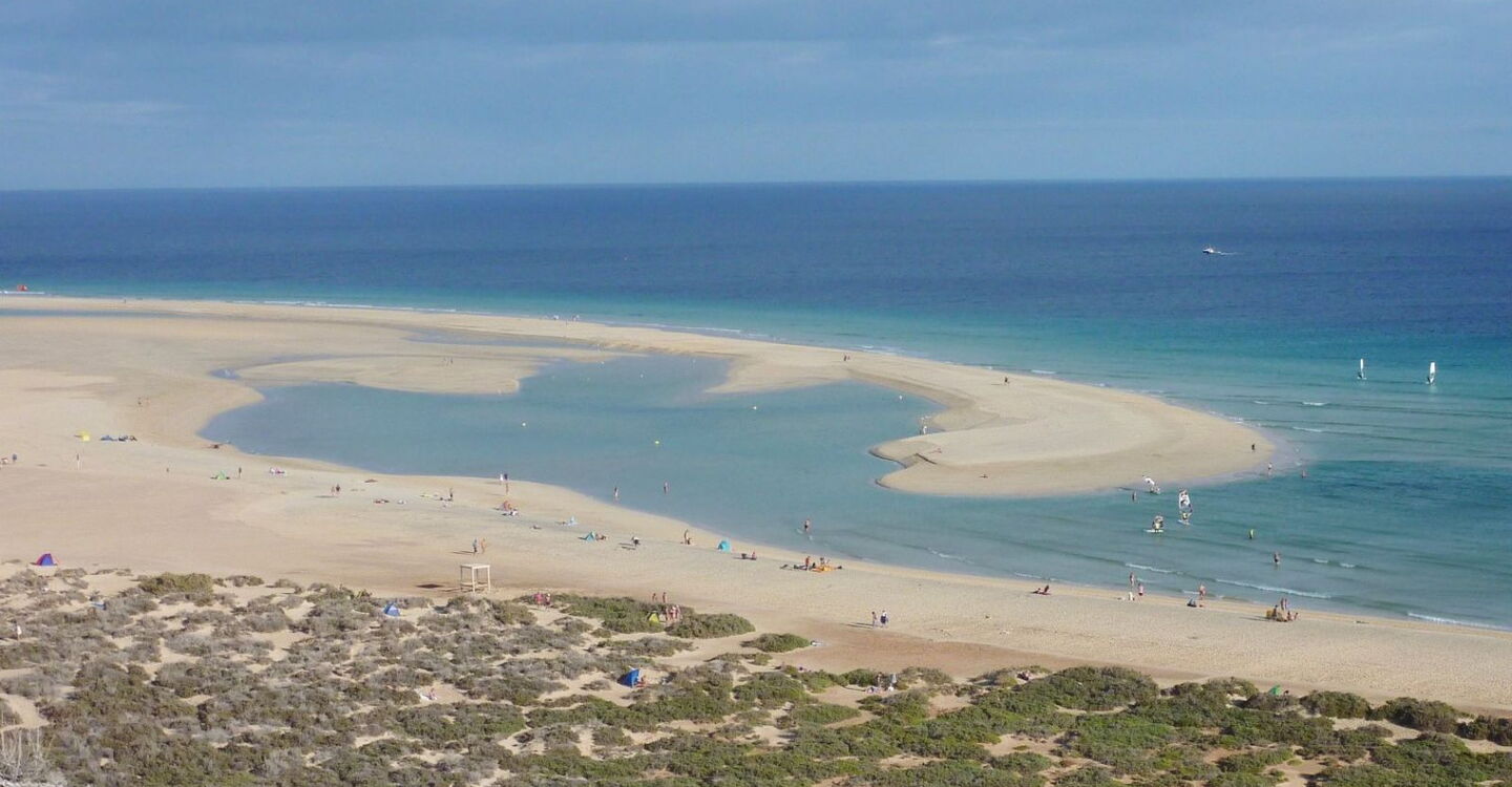 Bei dieser Wanderung über einen der schönsten Strandabschnitte – Playa Barca (km 0,5), Playa Risco del Paso (km 4,5), Playa El Salmo (km 6,6), Playa del Mal Nombre (km 7,6) und Playa de Esquinzo Butihondo (km 9,4) – der Insel geht es durch eine beeindruckende Lagunenlandschaft, die bei Ebbe zum Wattwandern einlädt. Wir kommen außerdem vorbei an zwei großen Wanderdünen, bevor wir einen weiteren Höhepunkt erreichen, eine kleine Kolonie von Atlashörnchen. Vor der Rückfahrt mit dem Bus kann man sich im Restaurant Marabu stärken.