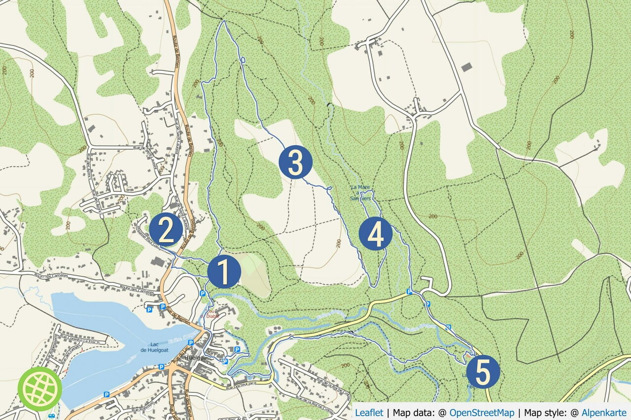 Vom Parkplatz – Start und Ziel der Wanderung – hinter der aus dem Jahr 1591 stammenden Église Saint-Yves de Huelgoat gehen wir bis zum Place Aristide Briand vor und dort rechts durch die Straße bis zum See. Hinter der Brücke befindet sich die alte Mühle Moulin du Chaos. Sie wurde 1339 erbaut und ist das älteste Gebäude in Huelgoat. Wir gehen bei der Crêperie rechts auf dem Pfad weiter. Zwischen den mit Moos bedeckten, riesigen Felsen hindurch erreichen wir die Grotte du Diable (Teufelsgrotte), bei der man über eine rutschige Eisentreppe in die Unterwelt absteigen kann. Auf dem weiterführenden Pfad geht es an mächtigen und rund geschliffenen Granitblöcken vorbei. Bei der ersten Weggabelung gehen wir dann halb links, überqueren den inzwischen unterirdisch verlaufenden Bachlauf und nehmen den ersten Treppenaufstieg, der an einer kleinen Höhle vorbeiführt. Über einen platt geschliffenen Felsen und in den Fels geschlagene Stufen gelangen wir zum 01 Roche Tremblante (164 m) herunter. Der sogenannte zitternde Felsen liegt auf einem schmalen Grat. Findet man den richtigen Druckpunkt in Kombination mit der richtigen Frequenz, so wird der 100 t schwere Granitblock in eine 2 bis 3 cm weite Schwingung versetzt! Bloß wo ist der Punkt?