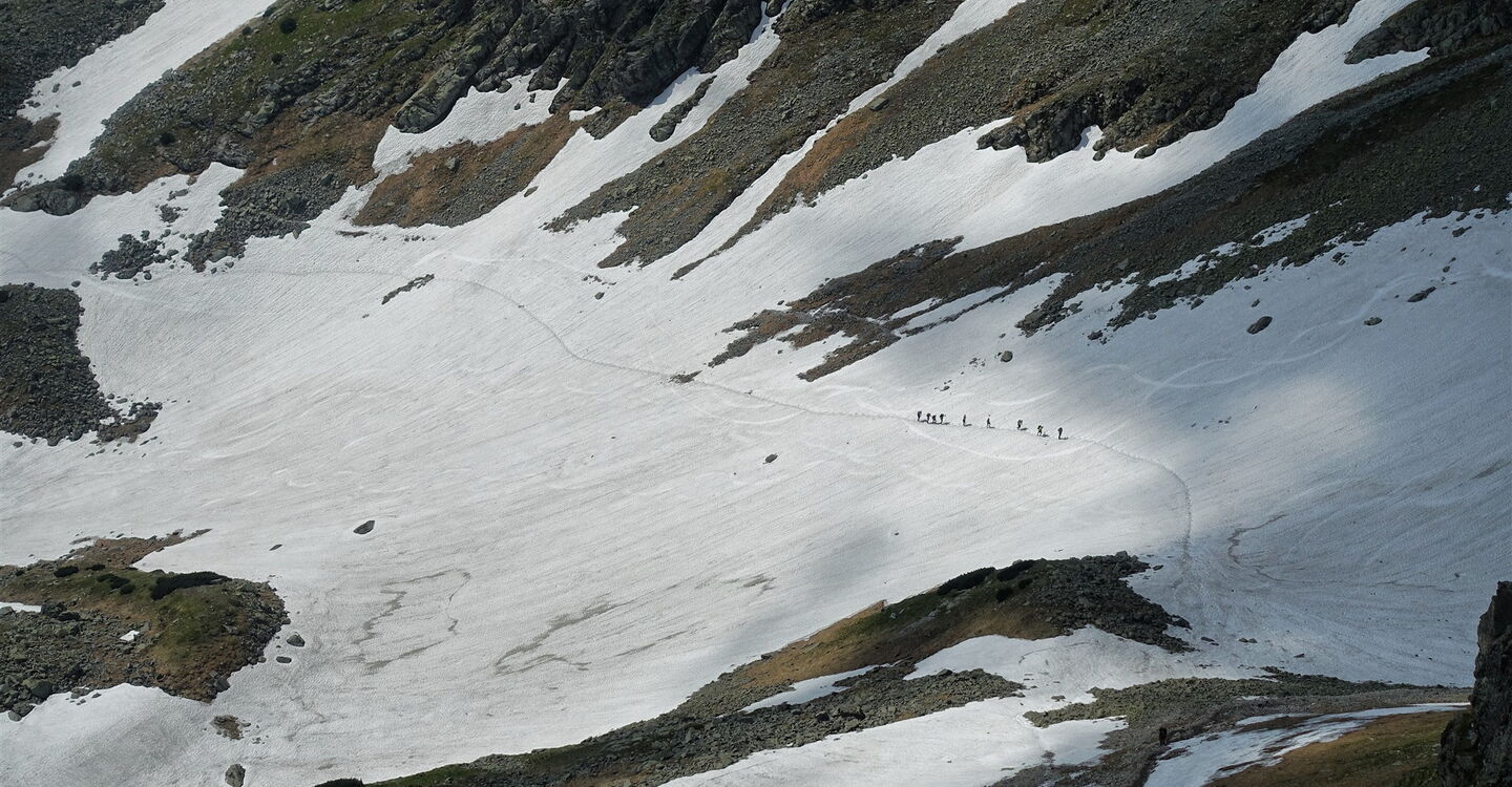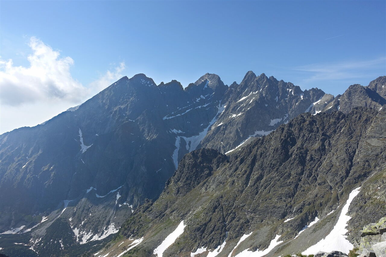 Befindet sich am linken Wegesrand ein kaum noch auszumachender (der Weg wurde offiziell gesperrt) 03 Abzweiger (1884 m) zum Gipfel des 2137 m hohen Berges Jastrabia veža, so gehen wir geradeaus weiter. Der Pfad führt durch ein weiteres Kar, bis in den Juni hinein läuft man über Firnfelder. Steigeisen oder Eispickel werden allerdings nicht benötigt, da der Pfad gemächlich ansteigt und meistens eine ausgetretene Spur vorhanden ist.