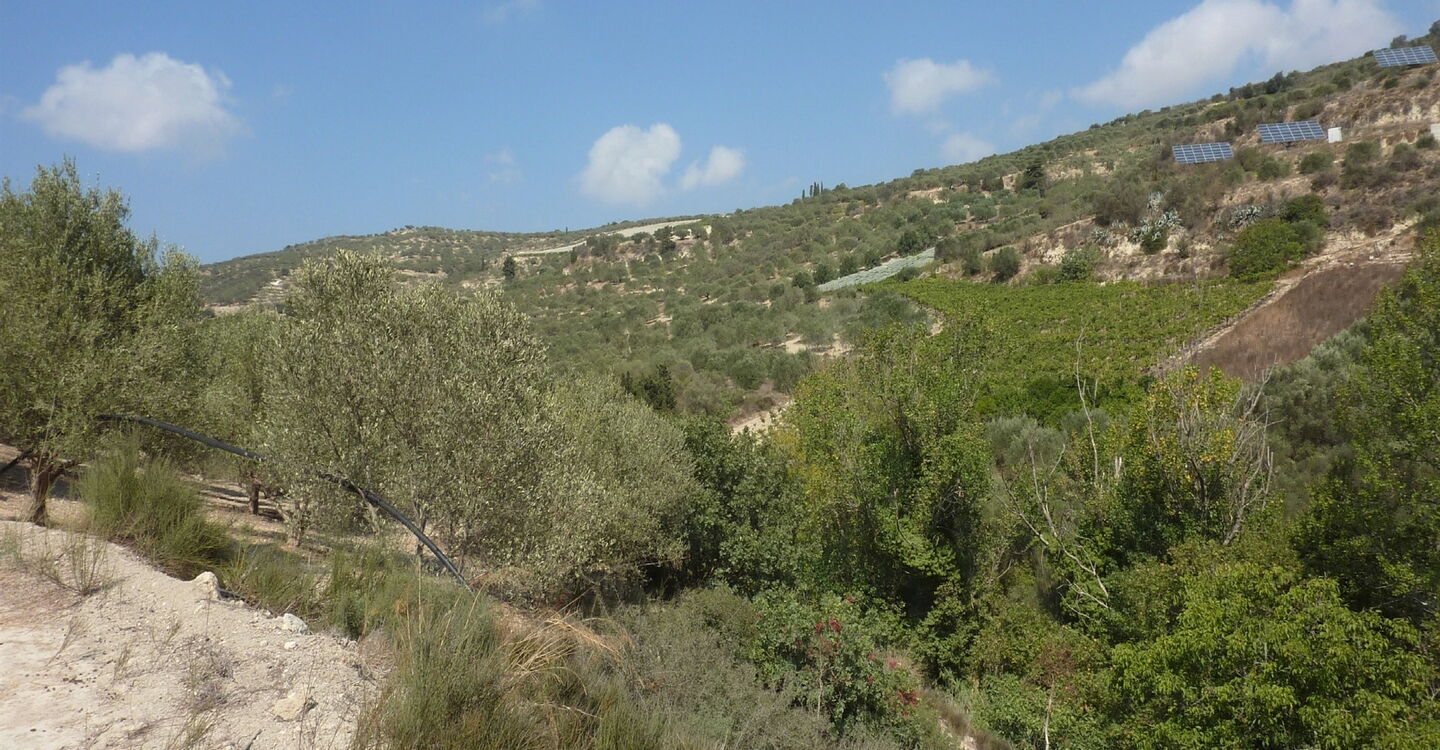 Wir gehen auf der ortsauswärts führenden Straße am Museum vorbei, um 50 m hinter einem Pinienwald links in die Asphaltstraße zu biegen, den Fußballplatz rechts liegen zu lassen und auf der Piste bergab zu gehen, bis diese endet. Rechts befinden sich Weinreben und rechts gehen wir auch auf dem folgenden betonierten Stück. Bei der 2. Möglichkeit gehen wir links zwischen einem Olivenhain und Weinreben hindurch, um dann auf den halb links liegenden Olivenhainen mit angrenzenden Platanen am Bachbett auf einen Pfad zu treffen. Wir befinden uns nun in der 04 Kounaviano-Schlucht (241 m). Nach weiteren 30 m überqueren wir das Bachbett – hier befindet sich ein Handlauf. Auf der anderen Uferseite gehen wir zunächst ein Stück links entlang, bis unter einem Walnussbaum ein Pfad in entgegengesetzter Richtung bergauf führt. Der Pfad geht in eine Schotterpiste über, die auch bald endet. Nach 90 m rechts gehen wir links steil bergauf. Wir überqueren einen Bergrücken und erreichen die Ortschaft Kounavi.