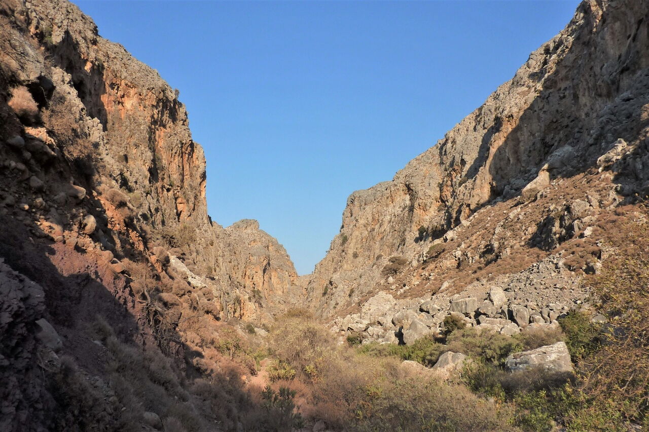 Es geht nun auf einem gut auszumachenden Trampelpfad durch den Canyon bis zu einer weiteren E4-Markierung. Hier verlassen wir die Schlucht aber noch nicht und gehen noch weitere 650 m. Wir treffen auf eine Wasserleitung, an der wir einen kleinen Wasserfall umlaufen. Kurz danach verlassen wir die Hauptschlucht durch eine kleinere 05 Schlucht nach links (104 m). Der Pfad endet und wir gehen links auf einer Schotterpiste bergauf, bis auch diese endet – an diesem Wegpunkt gehen wir halb rechts. Auf der folgenden Asphaltstraße gehen wir bis zum Dorfzentrum von Zakros.