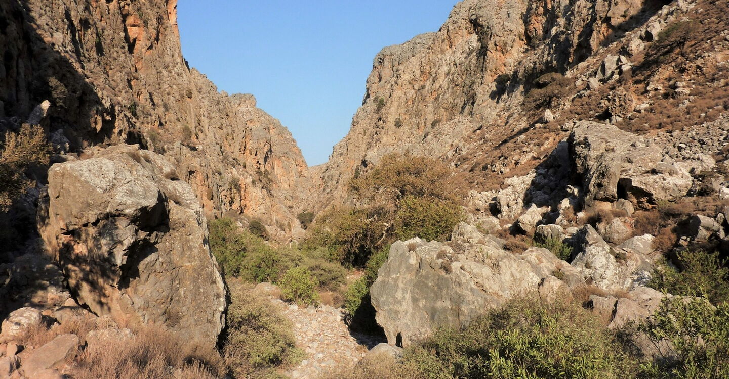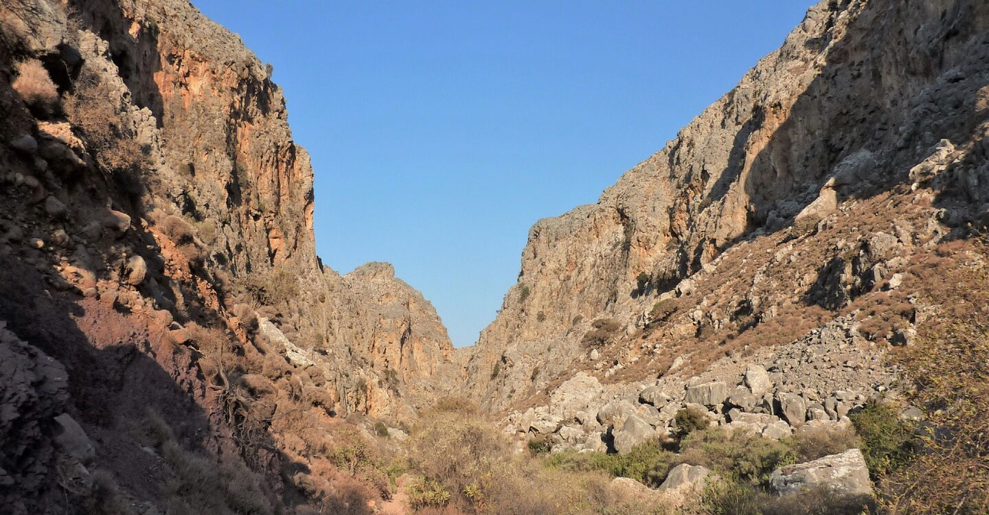 Die Schlucht der Toten gehört mit zu den interessantesten Schluchten auf Kreta und befindet sich am Anfang oder am Ende des europäischen Fernwanderwegs E4. Es geht durch eine fantastische Landschaft, denn der Canyon hat sich tief in seine Umgebung eingefräst und wird durch bis zu 200 m hohe dunkelrote Felswände begrenzt. Mit dem minoischen Palast von Kato Zakros erwartet uns zudem ein besonderes kulturelles Highlight. Diese faszinierende Wanderung verknüpft kulturelle und landschaftliche Höhepunkte – ein bleibendes Erlebnis.