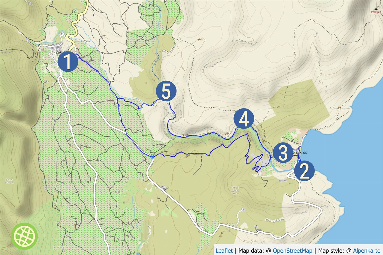 Charakter: Immer eindeutige Orientierung auf dieser leichten Wanderung. Art des Weges: 30 % Asphaltstraße, 35 % Schotterpiste und 35 % Pfad. Zusatzausrüstung: keine. Einkehr: Akrogiali Taverna am Ende der Straße in Kato Zakros und die Taverne Napoleon in Zakros. Beste Wanderzeit: ganzjährig. Variante: Diese Wanderung kann als Rundweg von Zakros gelaufen werden, aber auch als einfache Strecke von Karto Zakros nach Zakros, als erste Etappe des E4.