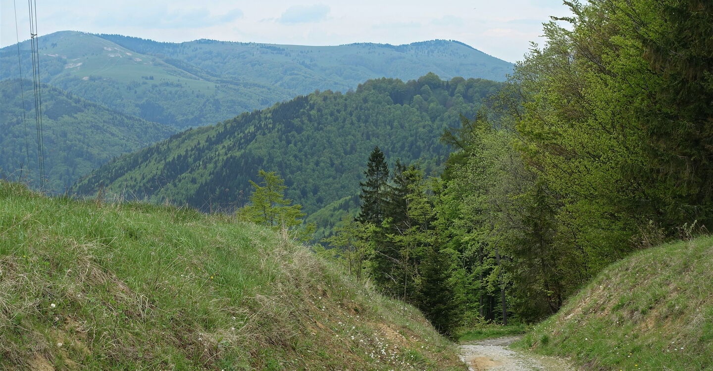 Auf dem nachfolgenden ebenen Wegstück gehen wir an der Weggabelung halb links. Unser Pfad durch den Wald mündet in eine Forststraße, wir gehen links und erreichen die Wegekreuzung 02 Prislop (1070 m). An dieser nehmen wir den ersten rechten Abzweiger in den Wald. Den sofort folgenden rechten Abzweiger ignorieren wir und bei der nachfolgenden Weggabelung – diese ist auf dem selten begangenen Pfad schwer zu erkennen – gehen wir nun halb rechts. Auch auf dem nachfolgenden Wegstück durch den Wald ist der Pfad nur schwer zu erkennen. Dort, wo der Wald lichter wird, ist wieder eine Trittspur vorhanden. Kurz später überschreiten wir den 1348 m hohen Skorušová. Wir erreichen ein Kahlschlagfeld und müssen uns unseren eigenen Weg durch die umgestürzten Bäume zu suchen.