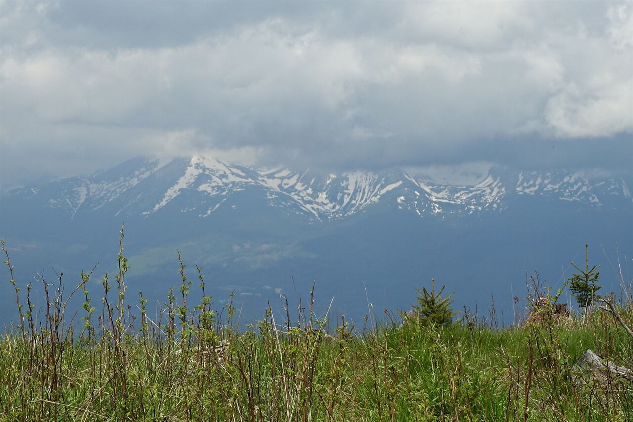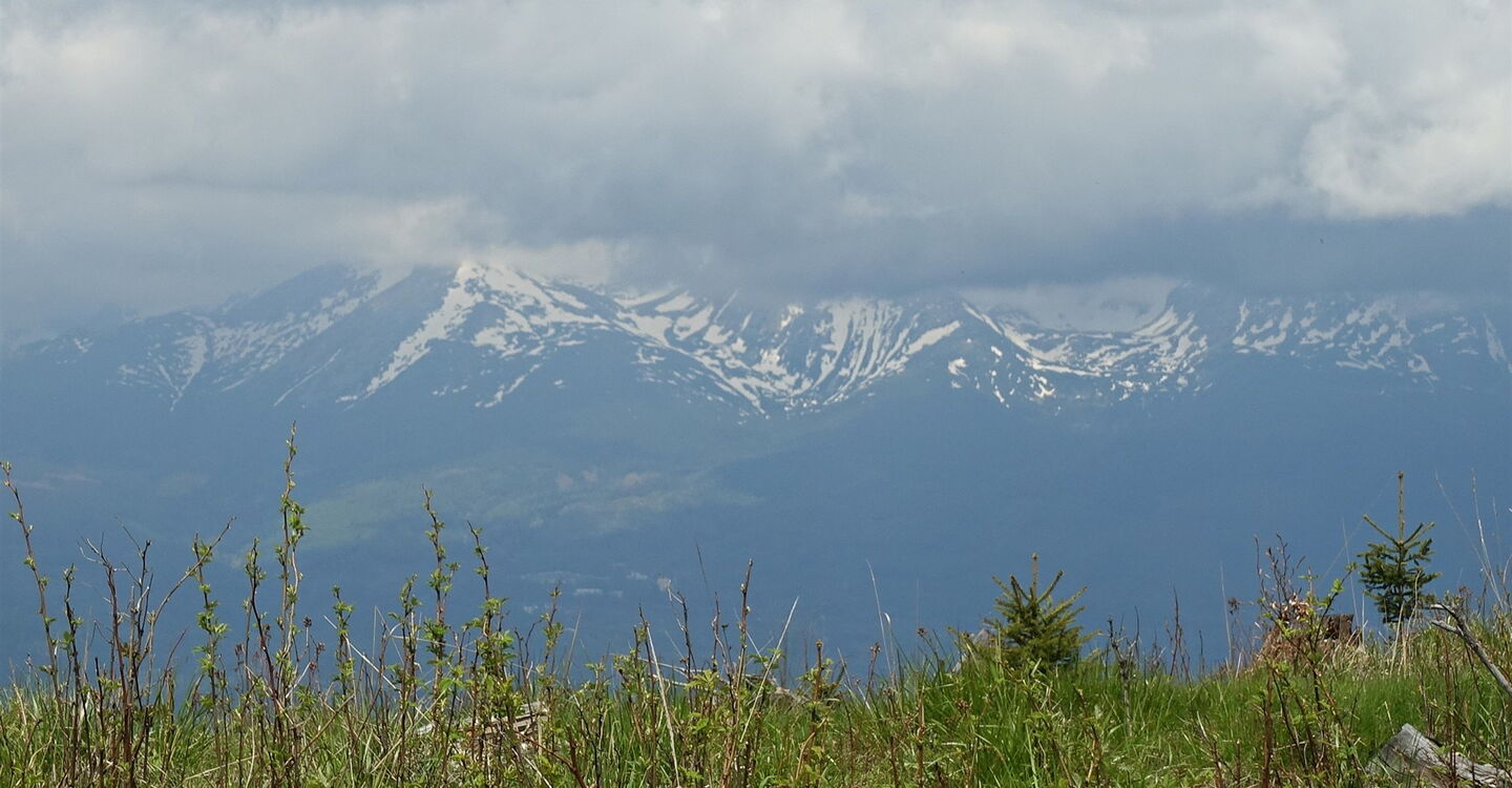 Wir folgen der Forststraße durch die Rechtskehre – hier befindet sich ein Markierungsstein mit der Nummer 145. Dann überschreiten wir eine kleine Anhöhe und gehen wenige Meter zu einer Einsattelung herunter. Direkt vor uns befindet sich ein kleiner Hügel. Seinen linken Berghang queren wir auf einem zunächst unscheinbaren Pfad. Die nachfolgende Einsattelung überqueren auf einem Pfad nach rechts, bis dieser an einem 03 querenden Pfad (1168 m) endet. Wir gehen nun rechts und folgen dem blau markierten Wanderweg. Nach einem schönen Waldweg gelangen wir in offenes Gelände und können bis zum Hauptkamm der Niederen Tatra schauen. Gut zu erkennen ist der Kráľova hoľa mit seinem Funkmast (siehe Tour 25).