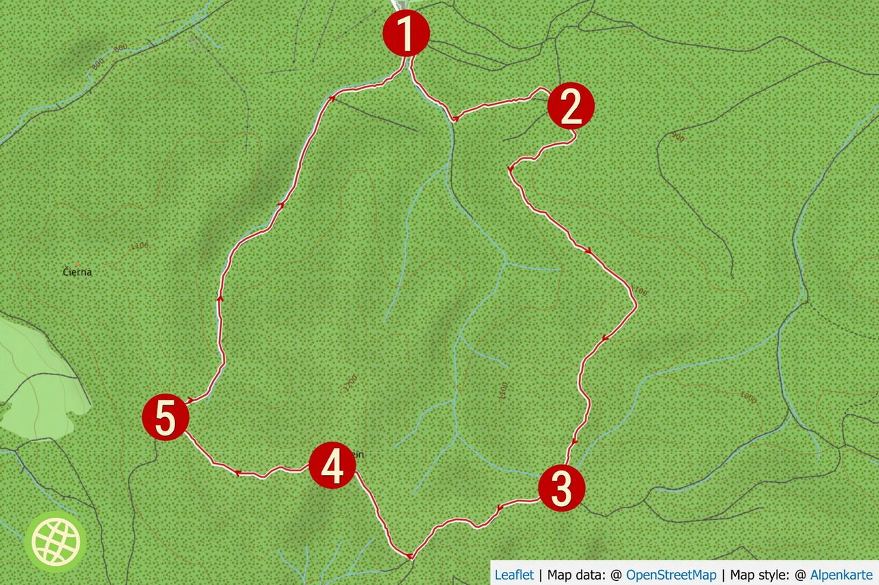 Auf einer Lichtung mit einer 05 Wegekreuzung (1065 m) gehen wir halb rechts und setzen unseren Abstieg auf dem grün markierten und nun breiten Wanderweg fort. Er ist auch Richtung Lopušná Dolina ausgezeichnet. Von rechts und links münden weitere Wege in den unsrigen. Noch vor dem Holzhaus, das wir bereits vom Hinweg kennen, gabelt sich der Weg vor einem Bachlauf und wir gehen halb links am Bachlauf entlang, bis wir wieder den Ausgangspunkt erreichen.