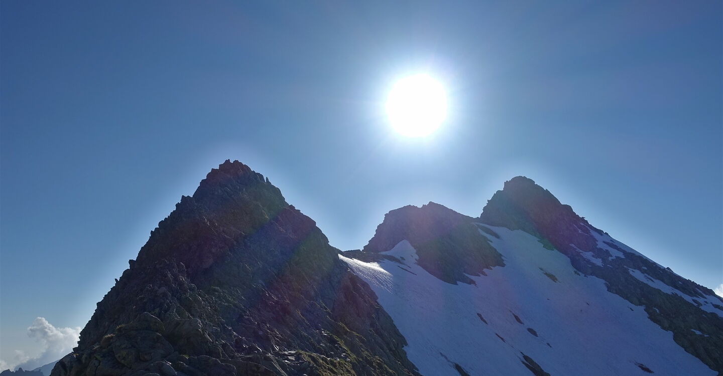 Notabstieg: Hinter der Einsattelung Przełączka nad Dolinką Buczynową führt links ein schwarzer Abstieg zur Hütte Schronisko PTTK Murowaniec. Nach 25 Minuten führt links ein grüner Steig bergab, auch dieser führt zur Hütte Schronisko PTTK Murowaniec. Weiter auf dem Höhenweg: Es erfolgt ein längerer Abstieg unterhalb des nördlichen Bergkamms, um dann rechts steil durch einen spektakulären Kamin aufzusteigen, den Komin pod Czarnym Mniszkiem. Wir erreichen den markanten Gipfel des 04 Skrajny Granat (2225 m). Hier beginnt dann ein luftiges Kletterabenteuer mit vielen ausgesetzten Passagen, Kettensicherungen und Eisenleitern. Der Klettersteig ist vorgegeben und bedarf keiner weiteren Erklärung. In den schattigen Lagen liegt noch bis Mitte Juni Schnee!