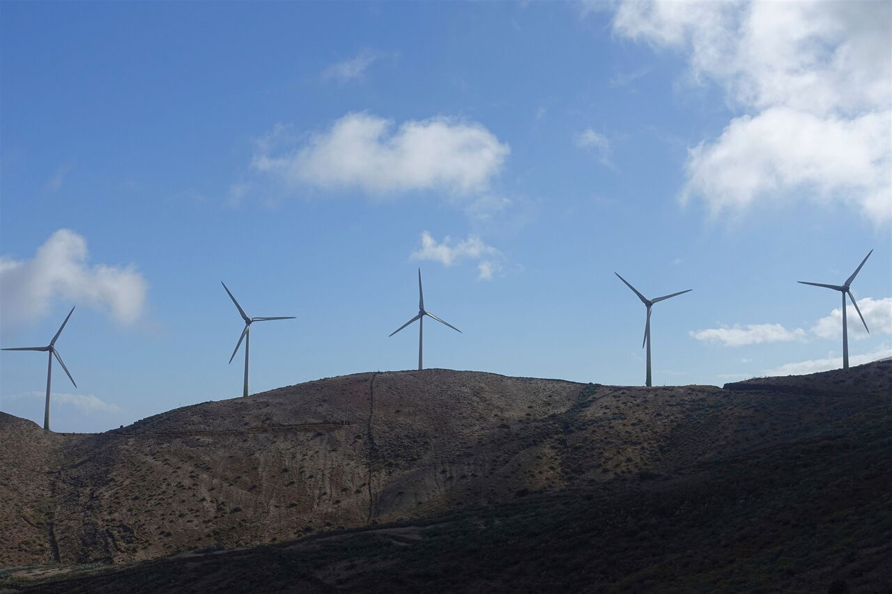 Hinter einer Anhöhe gehen wir nun direkt auf die fünf riesigen Windräder zu, bis die (04) Piste endet (488 m). Am Ziegengatter gehen wir halb links. Auf dem teilweise stark zugewachsenen Camino geht es durch dichtes Gestrüpp, entlang von eingestürzten Trockensteinmauern und quer liegenden Blütenstängeln von Agaven.