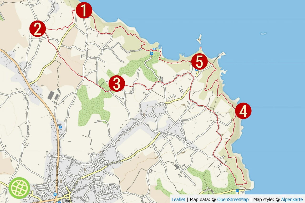Der nachfolgende Küstenpfad ist klar definiert, in Kürze ein paar Stichpunkte: Wir umlaufen eine lange Schlucht; es geht an einem Parkplatz vorbei; an einer Straße – rechts unterhalb befindet sich der kleine und romantische 05 Port Gwin Zégal (65 m) – gehen wir links bergauf, um dann rechts auf den weiterführenden Pfad zu gelangen; es geht an unerreichbaren Kieselsteinstränden vorbei; wir queren das obere Ende eines Parkplatzes, danach folgt noch einmal ein satter Anstieg; der Pfad mündet in eine asphaltierte Straße, hier gehen wir rechts; am Ende der Straße geht es auf dem weiterführenden Pfad bis zum Ausgangspunkt.