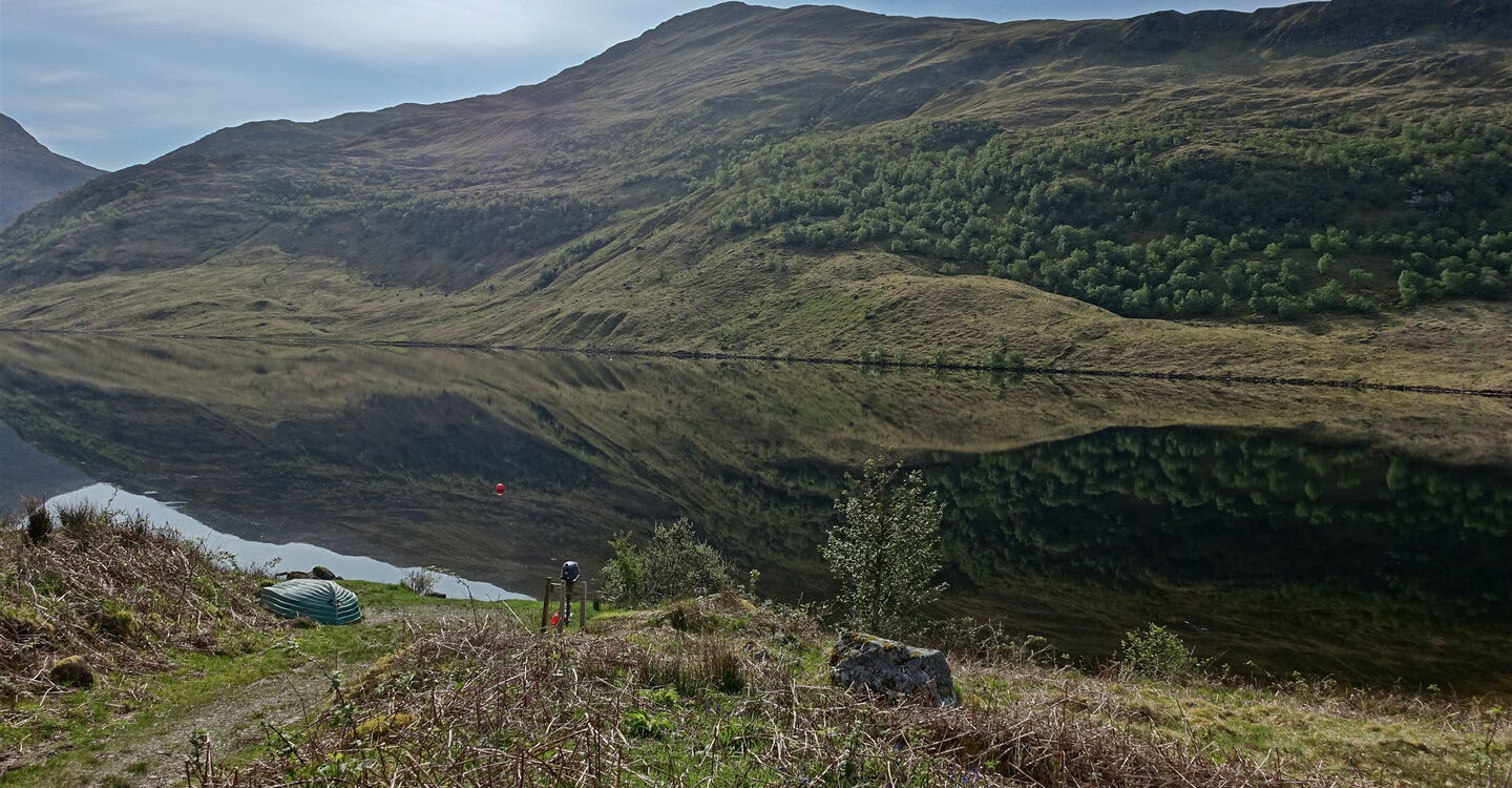 Hinter einer grünen Hütte erreichen wir den 02 Loch an Dubh-Lochain (62 m). Nach 6,75 km Zustieg beginnt nun die Bergtour. Hinter der Ruine führt noch ein kurzes Stück ein Pfad bergauf, dann ist kein eindeutiger Pfad mehr zu erkennen. Über Wiesen steigen wir steil und weglos auf und orientieren uns dabei an einem kleinen Bachlauf. Sobald wir in felsiges Gelände gelangen, weichen wir nach halb links aus. Sehen wir halb rechts ein weiteres Felsband, so queren wir unterhalb davon bis zur Einsattelung. Wir folgen dem faszinierenden schmalen Pfad auf dem Kamm Richtung Osten bis zu einer ersten Bergspitze auf 620 m Höhe.