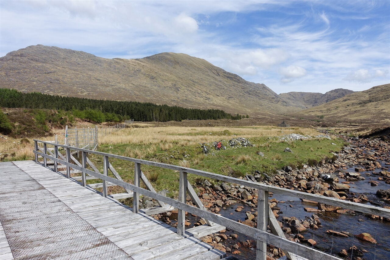 Über einen steilen Abstieg zu der Einsattelung Coire Dhorrcail folgen wir dem Pfad in nordwestliche Richtung. Danach folgt ein steiler Aufstieg, gelegentlich müssen die Hände zu Hilfe genommen werden und es gibt eine Kletterstelle mit dem Schwierigkeitsgrad 2. Hat der Ladhar Bheinn auf seiner südwestlichen Ausrichtung grasbewachsene Hänge, so tut sich unter seinem Gipfelgrat eine steile und zerklüftete Felswand, der sogenannten Coire Dhorrcail auf. Ein nun klar definierter Pfad führt zu dem größtenteils grasbewachsenen Grat hinauf und zum Gipfel des 04 Ladhar Bheinn (1020 m). Es gibt sensationelle Ausblicke entlang des Berggrats bis zu einem Trigonalpunkt, über die Weite des Meeres, zu den Cuillins auf der Insel Skye und rechts hinunter zur Barrisdale Bay und zum Loch Hourn.