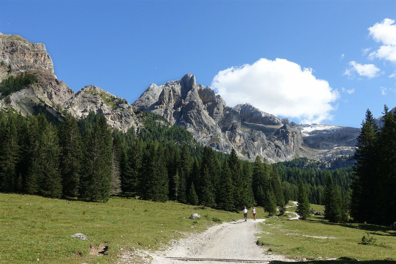 Auf dieser Forststraße gehen wir nun durch das wunderschön gelegene Val Contrin taleinwärts. Es geht an Kühen, Pferden, Schafen und Eseln vorbei, die sich auf den weiten Weideflächen sichtlich wohlfühlen. Bei km 9,8 kommen wir am Baita Cianci vorbei – eine nette Einkehrmöglichkeit, wo man auch übernachten kann. Wir erreichen das heutige Etappenziel, das 05 Rifugio Contrin (2.016 m).