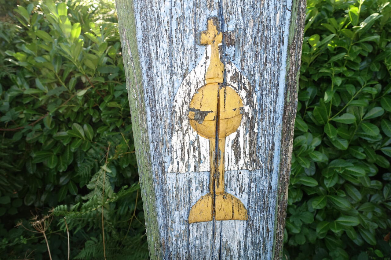 Dort, wo der Weg endet, gehen wir ein kurzes Stück links auf der Asphaltstraße. Sobald auch diese Straße endet, gehen wir rechts und bei der nächsten Möglichkeit wieder links – hier befindet sich ein Haus mit rotem Gartentor. Es folgt ein wunderschöner Hohlweg, bis es dann nach einer Straße, die wir überqueren, über Felder weitergeht. Hinter einer Linkskehre, gefolgt von einer Rechtskehre, ist die Wegführung nicht eindeutig; hier gehen wir direkt auf Häuser zu. Bei einem mit Efeu zugewachsenen Haus endet der Pfad. Hier gehen wir links und an der nachfolgenden Straße bis zur Hauptstraße vor, an der wir dann links gehen. Nach 200 m erreichen wir das 02 La Croix de la Dieuverrie (73 m), eines der seltenen gut erhaltenen Holzkreuze im Département. Beachten Sie von oben nach unten eine Dornenkrone, eine Monstranz, einen Kelch sowie 31 Münzen als Symbol des Verrats des Judas.