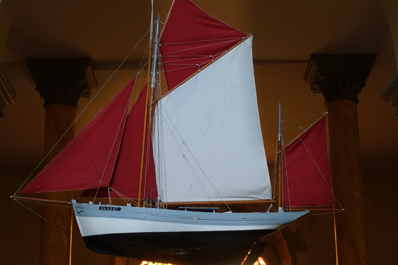 Kurz hinter einem Teich und einer Quelle gehen wir auf der nachfolgenden Straße links, um hinter dem Haus mit den roten Rollläden halb rechts auf die Piste abzuzweigen. Hinter dem Klettergarten endet die Piste und wir gehen links auf der Straße bis zur nächsten Kreuzung nach 250 m vor. Hier gehen wir rechts und erreichen die Inselhauptstadt. Durch die Fußgängerzone gehen wir direkt auf die 05 Église Saint Tudy (27 m) zu. Anstatt eines Wetterhahns ziert ein Thunfisch die Spitze des Glockenturms. Er erinnert an die Zeit Anfang des 20. Jahrhunderts, als die Insel der führende Thunfischhafen Frankreichs war. Wir verlassen den Kirchplatz in nördliche Richtung auf der Rue de St. Albin, kommen an einer Lagerhalle vorbei, gehen ein kurzes Stück neben einem Bachlauf her und biegen vor weiteren Lagerhallen links und dann sofort wieder rechts ab. Auf der nachfolgenden Straße gehen wir gerade durch ein kleines Industriegebiet. Dort, wo es links in die Sackgasse geht, gehen wir geradeaus weiter und erreichen einen schönen Aussichtspunkt oberhalb des Hafens.