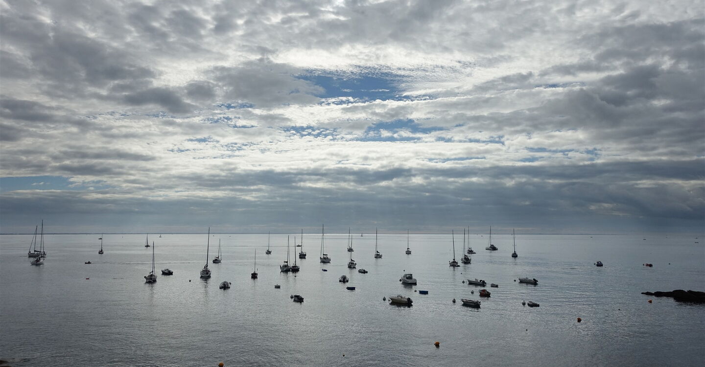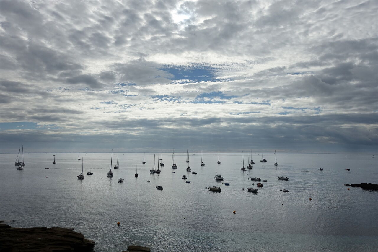 An dem charmanten bretonischen Hafen 01 Port Tudy (12 m) angekommen, gehen wir links über das Hafengelände. Wir kommen vorbei an prächtigen Reederhäusern, um dann bei den Duschen und einem blauen Geländer links bis zum Ende der Kaimauer vorzulaufen. Bei dem mit Holz verkleideten Haus mit blauen Fenstern halten wir uns rechts und hinter den Treppen erreichen wir den Küstenpfad. Am Ende des Pfads gehen wir links und bei der darauffolgenden Weggabelung erneut links. Kleine Aussichtspunkte erlauben schöne Fernblicke über das Meer bis zum Festland.