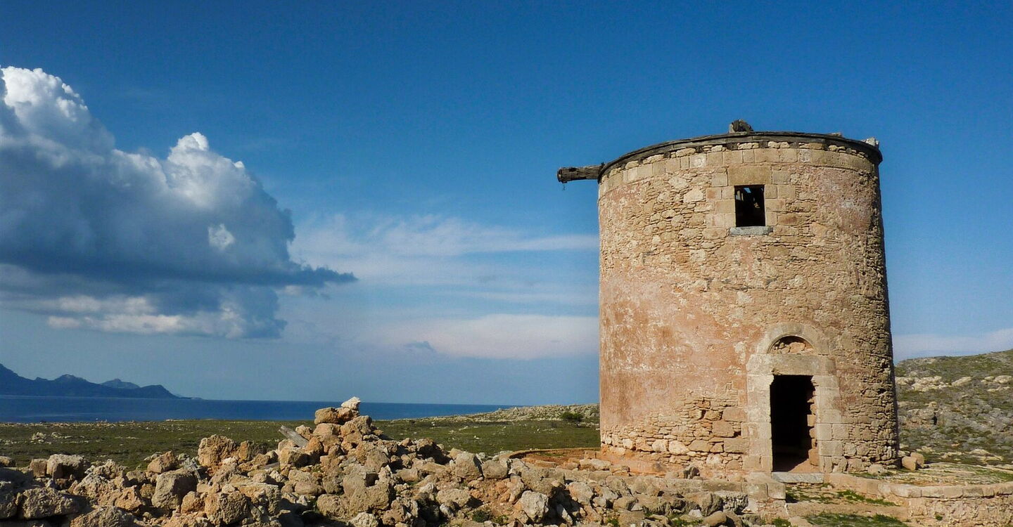 Beim Abstieg von dem Hügel folgen wir dem Pfad zu den Überresten einer (05) Windmühle (17 m). Nach einem Mauerdurchbruch treffen wir auf den Hinweg und gehen auf diesem bis zum Ausgangspunkt zurück.