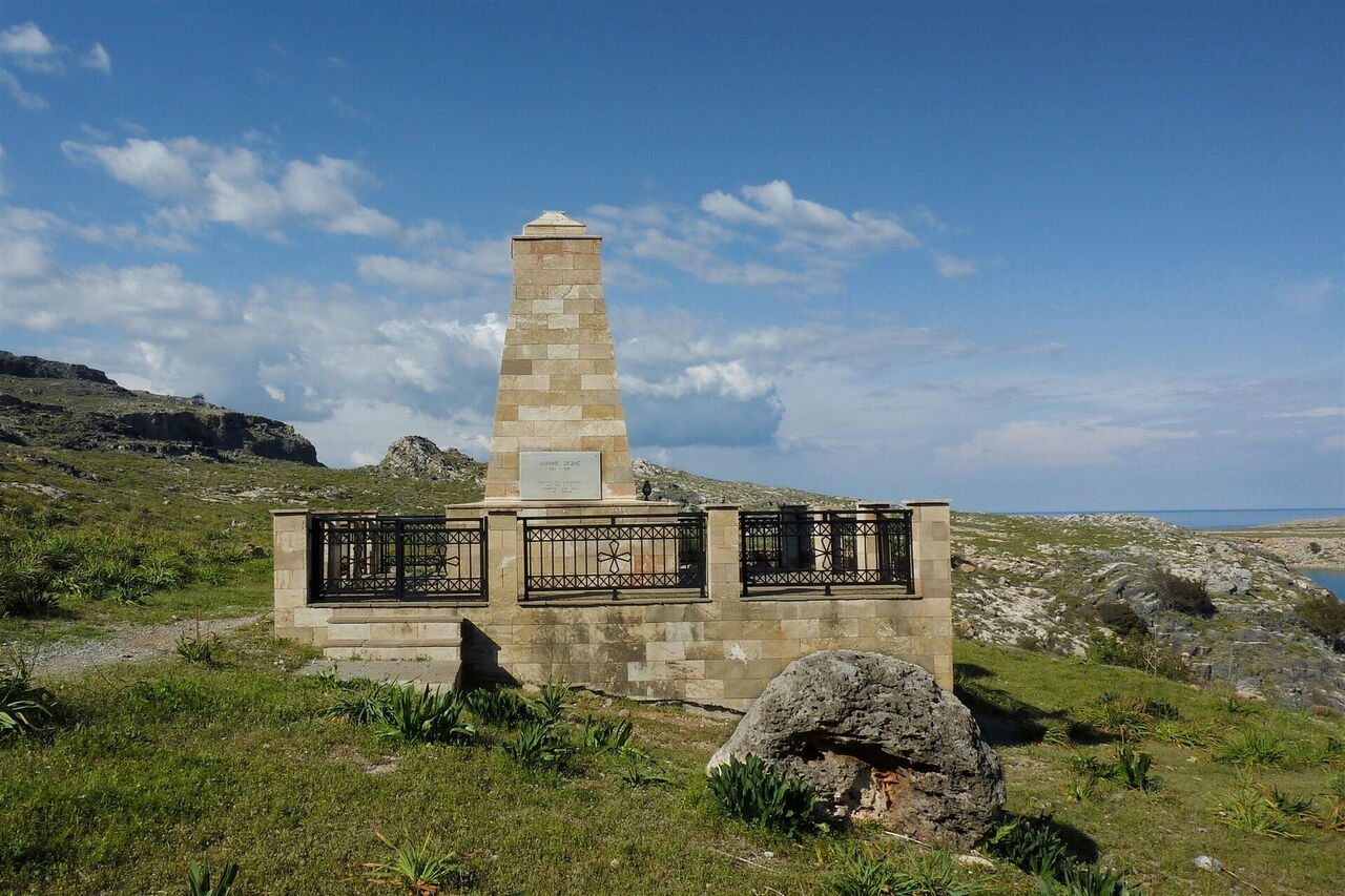 Am Parkplatz weisen bereits Wegweiser zur Grabstelle, die wir heute besuchen. Von der Pforte am (01) Parkplatz (33 m) gehen wir scharf rechts, dann entlang der Mauer oberhalb des Parkplatzes und vorbei am modernen Gedenkstein für Yannis Zigdis. Rechts unterhalb von uns liegt der wunderschöne Strand von Lindos und im Hintergrund das romantische Häusermeer.