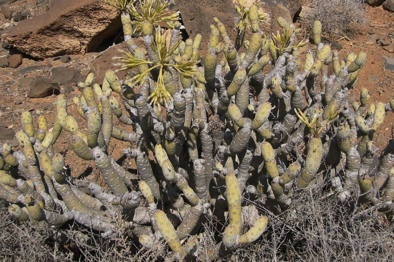 Wir haben jetzt bereits 2,2 km zurückgelegt, das Barranco ist sehr eng und steinig geworden. Sobald wir in dieser kargen Gegend auf Höhe der oberhalb wachsenden Wolfsmilchgewächse angekommen sind, steigen wir nach weiteren 700 m weglos aus dem (03) Barranco (233 m) und wechseln auf die Asphaltstraße. Dieser folgen wir bis zum Ende bei der Degollada de los Canarios. Das erste Etappenziel ist erreicht und wir werden mit einem grandiosen Blick auf die 350 Höhenmeter tiefer liegende Küste belohnt.