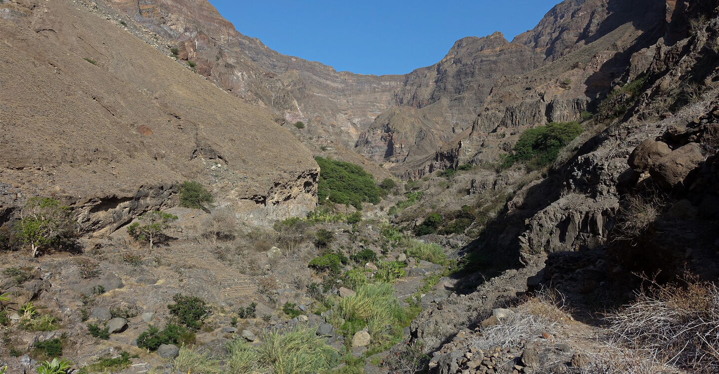 In der Vergangenheit wurde der komplette Warenverkehr mit dem Dorf über einen Caminho geregelt, eine Zufahrtsstraße gab es noch nicht. Dabei waren jedes Mal 530 Höhenmeter zu überwinden. Am Miradouro befanden sich eine große Verladestelle und eine Lagerhalle, in der die Waren auf ihren Weitertransport warteten. Der alte Caminho ist inzwischen in die Tage gekommen und wird heutzutage auch nicht mehr für Transportzwecke genutzt. Geblieben ist ein wunderschöner Wanderweg, von dem man im oberen Abschnitt einen spektakulären Blick auf den höchsten Berg von Santo Antão genießt. Nachdem man den Pass überschritten hat, führt die Tour durch eine rotbraune Wüstenlandschaft, bis zu einem der schönsten Strände von Santo Antão. Zur Blauen Stunde ist diese Runde ein ganz besonderes Erlebnis.