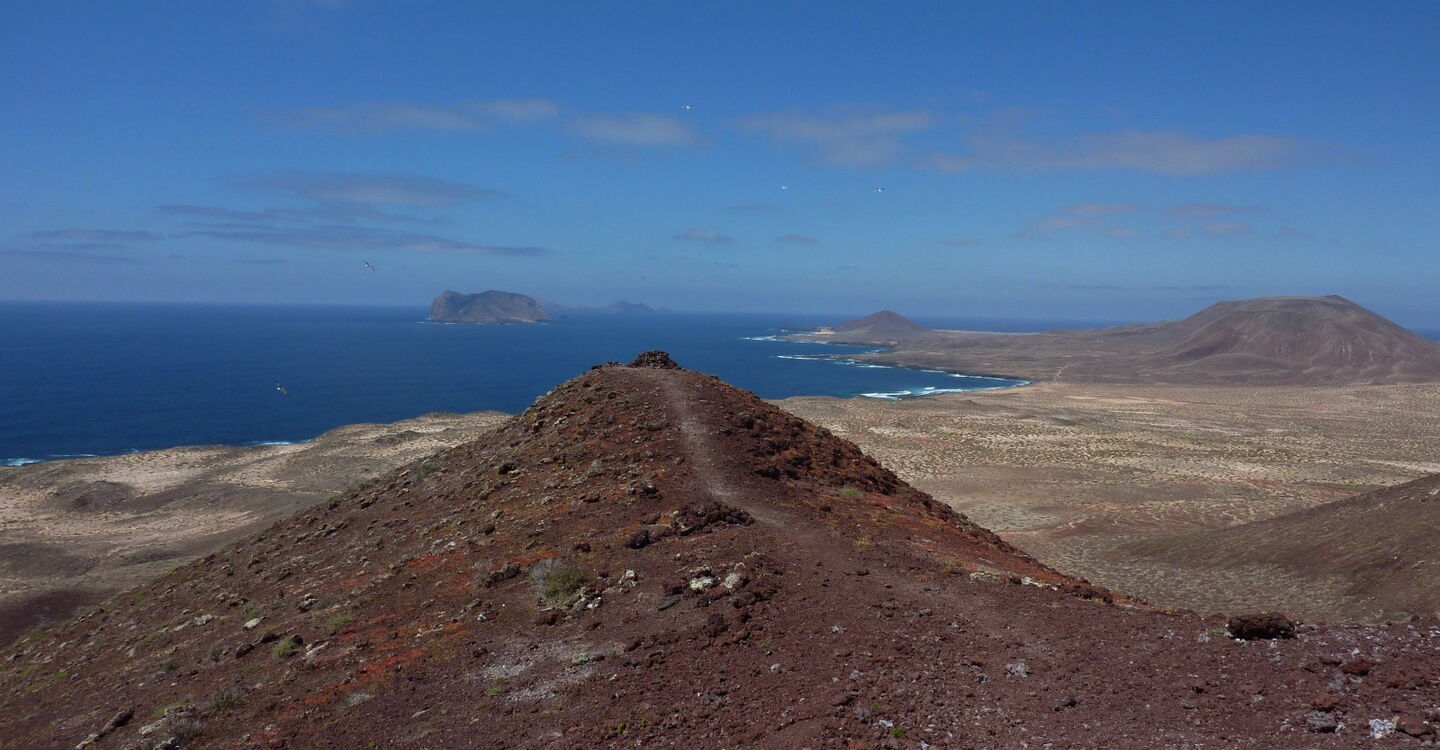 Hinter diesem Hügel befindet sich ein weiteres Barranco, dem wir nun in südlicher Richtung folgen, bis wir auf einen Pfad stoßen, der uns im Zickzack auf den Nebengipfel der (04) Montaña Amarilla (148 m) führt. Der Vulkangipfel mit garantierten Traumblicken lädt zum Verweilen ein. Aber auch ein Warnhinweis muss ausgesprochen werden: Im Mai brüten auf dem Nebengipfel viele Möwen, die ihre Nester mit allen Mitteln verteidigen, wenn man diesen zu nah kommt! Den eingeschlagenen Weg gehen wir Richtung Hauptgipfel und im weiteren Verlauf wandern wir auf dem Grat bergab. Dann folgen wir dem Weg rechts um den Vulkan herum.