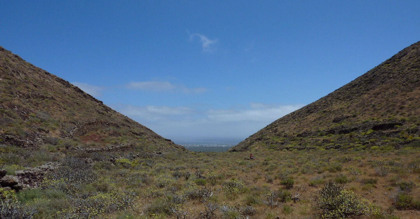 Von der (01) Bushaltestelle (97 m) bzw. dem Parkplatz geht es rechts in die Calle Sta. Margarita, die in westliche Richtung führt. Wir treffen auf eine Stichstraße und gehen dort rechts und bei der nächsten Möglichkeit erneut rechts auf die LZ-405/Calle Tarajal. Danach führt eine Asphaltstraße links bergauf, vorbei an einen rechts liegenden Friedhof, gerade auf ein Wasserreservoir zu. Hier können wir entweder der Asphaltstraße in einer großen Linkskehre weiter folgen oder über einen schmalen Pfad bergauf abkürzen, der direkt neben dem Wasserreservoir beginnt.