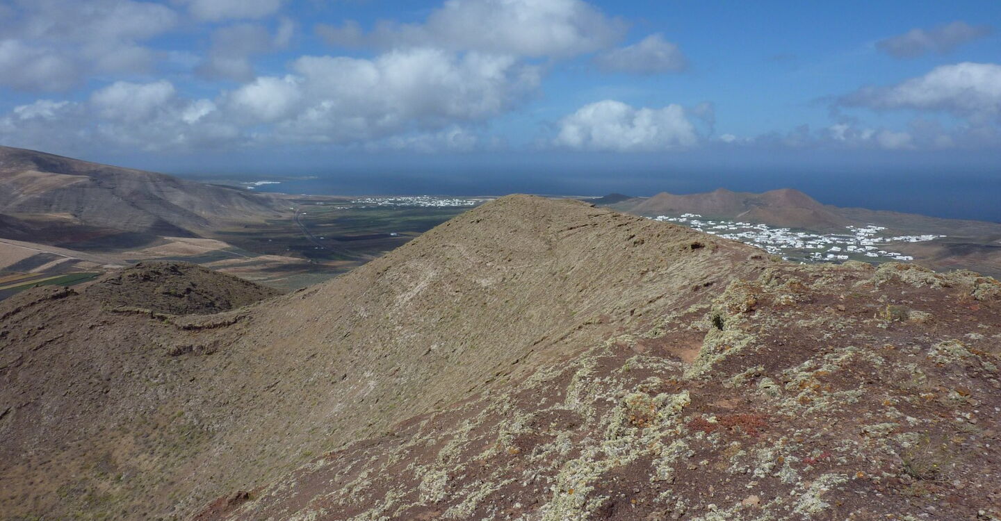 An dieser Stelle verlassen wir den Hauptweg nach rechts in den Hang. Dabei steigen wir links vom Loch, weglos in Kehren, bis auf den Gipfel der (05) Montaña de Guenia (358 m). Im weiteren Verlauf führt der Pfad auf dem Grat entlang, bis wir in den offenen Vulkankessel schauen können. Links auf dem Grat führt ein Weg in den Vulkangrund, aber wir gehen rechts auf dem Grat entlang, um dann steil und weglos abzusteigen. Wir treffen auf eine Schotterpiste und gehen diese links durch ein Barranco. Nach einer Rechtskehre erreichen wir die Asphaltstraße. 250 m später verlässt ein Pfad die Asphaltstraße nach rechts zu einem Gebäude, um anschließend wieder auf die Asphaltstraße zu gelangen. Vorbei geht es am Friedhof, in Kehren bergab, über die LZ-1, um dann zum Start und Ziel in Guatiza zu gelangen.