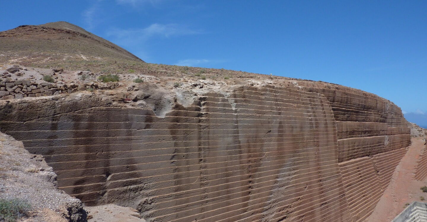 Kurz hintereinander folgen zwei Weggablungen. Bei der ersten gehen wir links und bei der zweiten rechts. Der Weg führt nun leicht bergauf, vorbei an bis zu 20 m hohen Wänden aus dunklem, feinkörnigem Eruptionsgestein. Wir wandern nun stetig bergauf, ignorieren einen Abzweiger nach links und einen nach rechts und gehen nun direkt am Fuße der Montaña de Guenia, bis wir die (04) Schlüsselstelle (251 m) erreichen. Die Steigung der Schotterpiste ist geringer geworden und links vom Hauptweg zweigt eine weitere Piste ab. Rechts von uns, im Hang, ist die Erde abgerutscht, wodurch ein 40 × 50 m großes Loch entstanden ist.