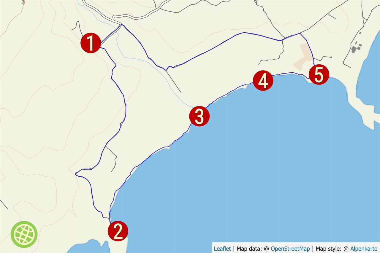 Wir sind nun nahezu am Ende der Bucht angelangt, umlaufen nur noch eine felsige Landspitze und erreichen eine kleinere Bucht. Hier orientieren wir uns in Richtung der betonierten (05) Treppen (12 m). Direkt vor dem Treppenansatz gehen wir halb links und zwischen den beiden Grundstücken hindurch. Bei Eukalyptusbäumen beginnt eine Schotterpiste. Nach 400 m endet diese und wir gehen links bis zu einem Olivenhain, wo auch dieser Weg endet. Wir gehen in der Schlucht rechts und sehen links oberhalb bereits die Kapelle am Start und Ziel unserer Wanderung.
