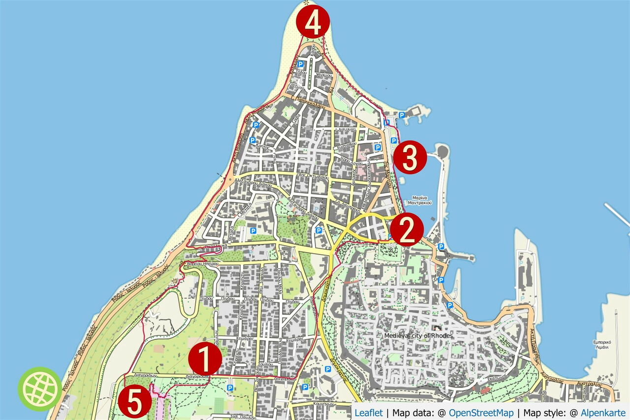 Vom (01) Start und Ziel bei der Akropolis (43 m) gehen wir links auf der Anfahrtsstraße, lassen den Busparkplatz rechts liegen und queren geradeaus die Kreuzung am Stoppschild. Nach 200 m endet diese Straße, auf der gegenüberliegenden Straßenseite befindet sich eine Ruine, hier gehen wir links Richtung Stadtmitte. Wir erreichen ein kleines bewaldetes Stück mit einer grünen Verkehrsinsel, hier halten wir uns halb links und erreichen eine zweite begrünte Verkehrsinsel. Beim Kinderspielplatz und den Cafés gehen wir rechts in die Straße, überqueren die Hauptstraße – rechts durch die Bäume kann man den Großmeisterpalast ausmachen – und gehen nun zunächst zwischen Hauptstraße und Burggraben.