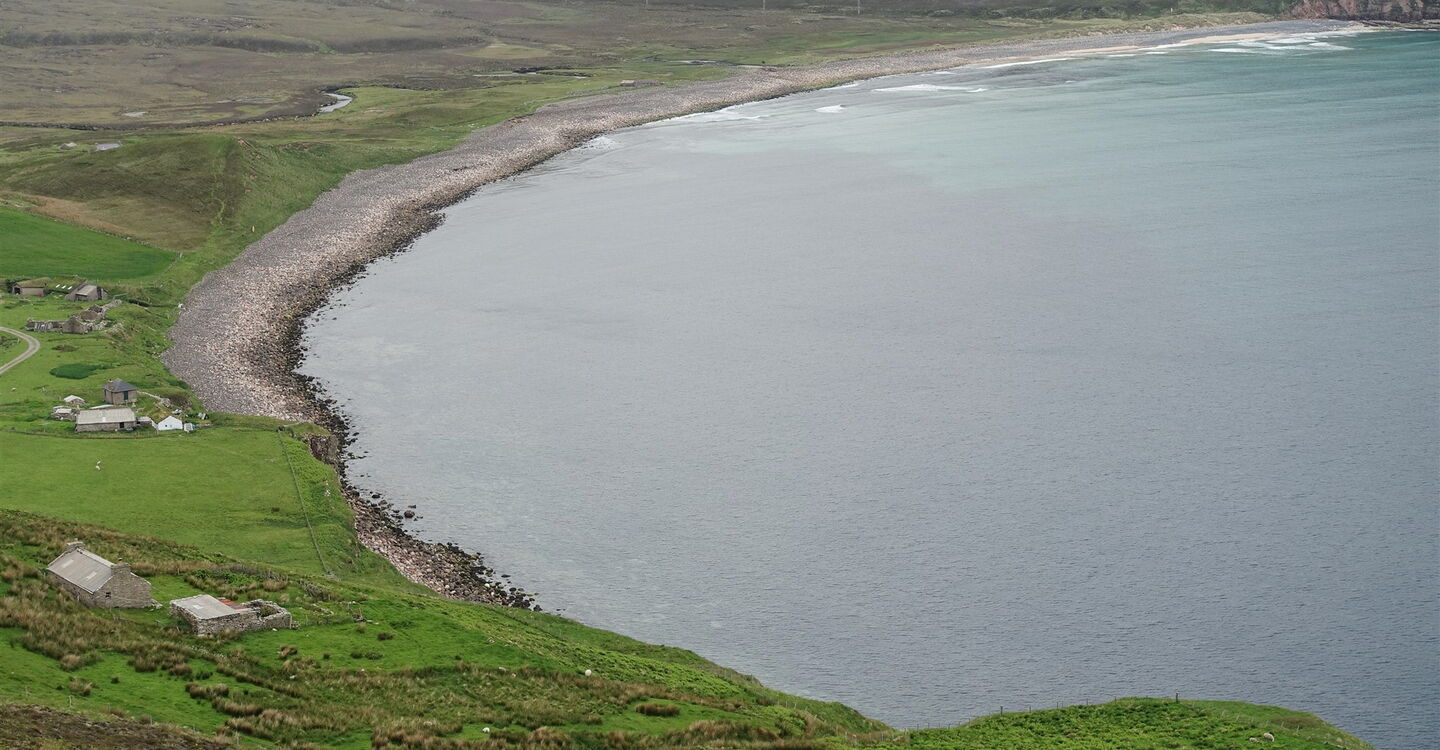Nachdem wir ein gutes Stück vorangekommen sind, sehen wir rechts unterhalb die Bucht mit dem 05 Rackwick Beach (134 m). Wir gehen in Richtung einzelner Häuser im Landesinneren und nicht rechts bergab. Sobald wir die Straße erreicht haben, gibt es die Möglichkeit – wie in der Variante beschrieben –, mit einem Shuttlebus zurückzufahren. Die Straße mündet in eine weitere Straße und direkt hinter einer kleinen Brücke biegen wir links auf den angelegten Pfad ab. Dieser zieht sich durch ein Tal zwischen dem links liegenden Berg Cuilag und dem mit 479 m höchsten Berg der Insel, dem Ward Hill. Am Ende des Weges erreichen wir den gestauten See und gehen auf dem bekannten Hinweg zurück zum Fähranleger.