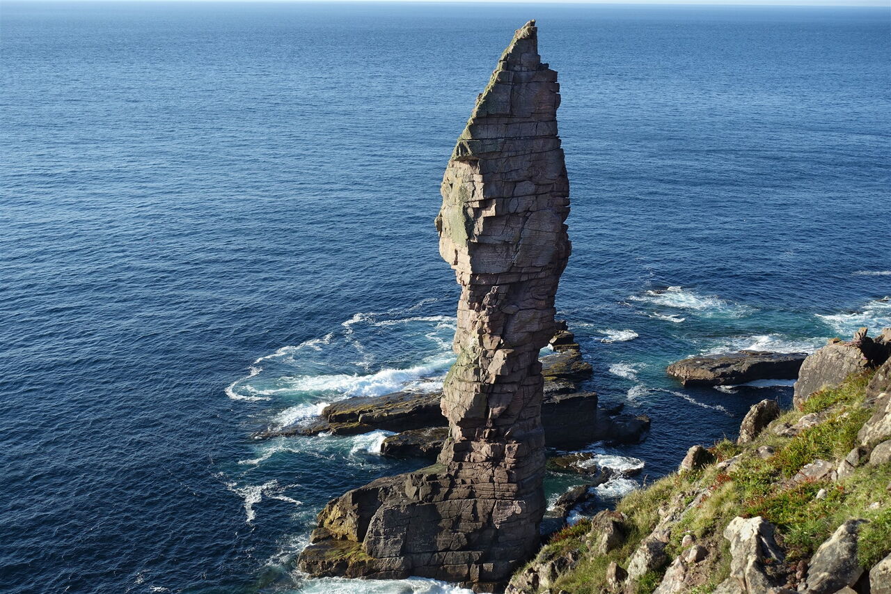 Auf dem Küstenpfad steigen wir noch ein kurzes Stück auf, um dann steil abzusteigen und die Grasfläche oberhalb des 03 Old Man of Stoer (67 m) zu erreichen. Die Erstbesteigung der Felsspitze geht an Dr. Tom Patey. Noch schwieriger als die Besteigung ist es wohl, durch das ungestüme Meer an den Sockel der Felsspitze zu gelangen.