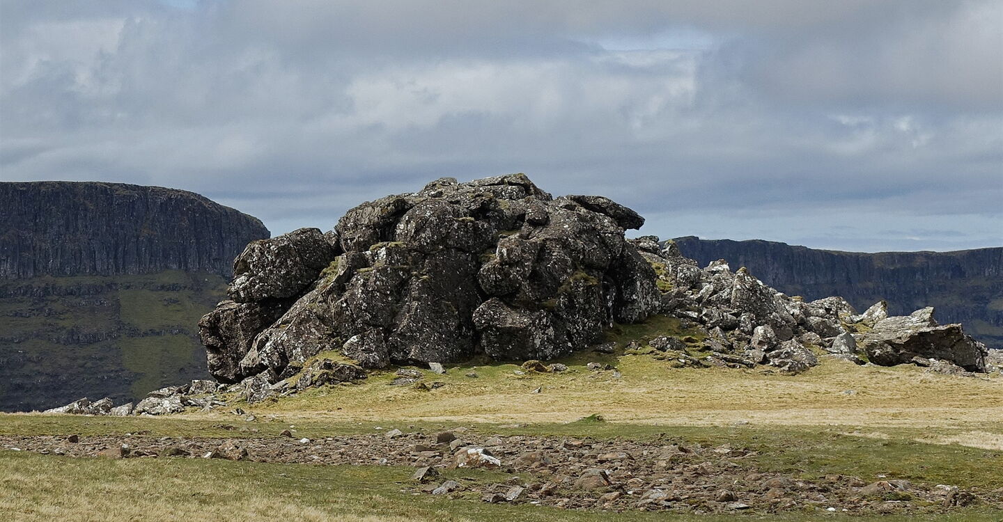 Dieser führt nun spektakulär entlang der Abbruchkante des mächtigen Erdrutschs vor 15.000 Jahren und gewährt faszinierende Tiefblicke auf den Old Man of Storr und seine Kinder. Während sich unterhalb an schönen Tagen die Touristenscharen drängen, steigen wir im Alleingang auf Grashängen bis zum Gipfel des 03 The Storr (719 m) auf. Während die felsige Ostseite des Gipfels gut 300 Höhenmeter senkrecht abfällt, sind das Gipfelplateau sowie seine Ostseite dagegen unspektakulär, leicht abfallend und mit Gras bewachsen. Ja, das Grün ist so kurz gehalten, dass man es als "Englischen Rasen" bezeichnen könnte, wären wir nicht in Schottland.