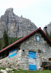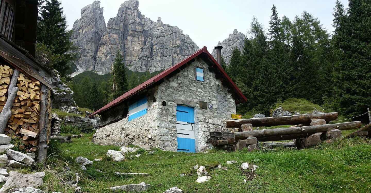 Wir steigen über gerölligen und rutschigen Untergrund in einem Talkessel ab, der von den riesigen Dolomitfelswänden der südlichen Bosconerogruppe eingefasst wird. Nachdem wir die Latschenkiefern hinter uns gelassen haben, erreichen wir federnden Waldboden und das 04 Bivacco Casera Campestrin (1.658 m). Hier gibt es direkt an der Hütte eine Quelle. Auf einem eindeutig auszumachenden Pfad geht es talwärts, teilweise in steilen und engen Kehren, bis wir bei Wiesengelände die Casera Valbona (1.241 m) erreichen, die seit den 1960er Jahren nicht mehr bewirtschaftet wird.