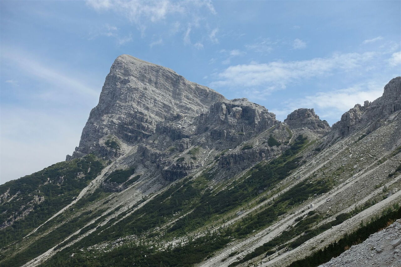 Wir gelangen an eine weitere Wegekreuzung mehrerer 02 Sentieri (1.848 m) und gehen halb links auf der ausgeschilderten Wegnummer 483 nach Ospitale di Cadore. Nur noch ein kurzes Stück gehen wir durch den Wald, dann geht es durch Latschenkiefern und Schutthalden unterhalb des 2.410 m hohen Berges Sfornioi Nord. Wir gehen Richtung Osten, wo sich der schroffe Felsgipfel des 2.413 m hohen Sassolungo di Cibiana auftürmt.