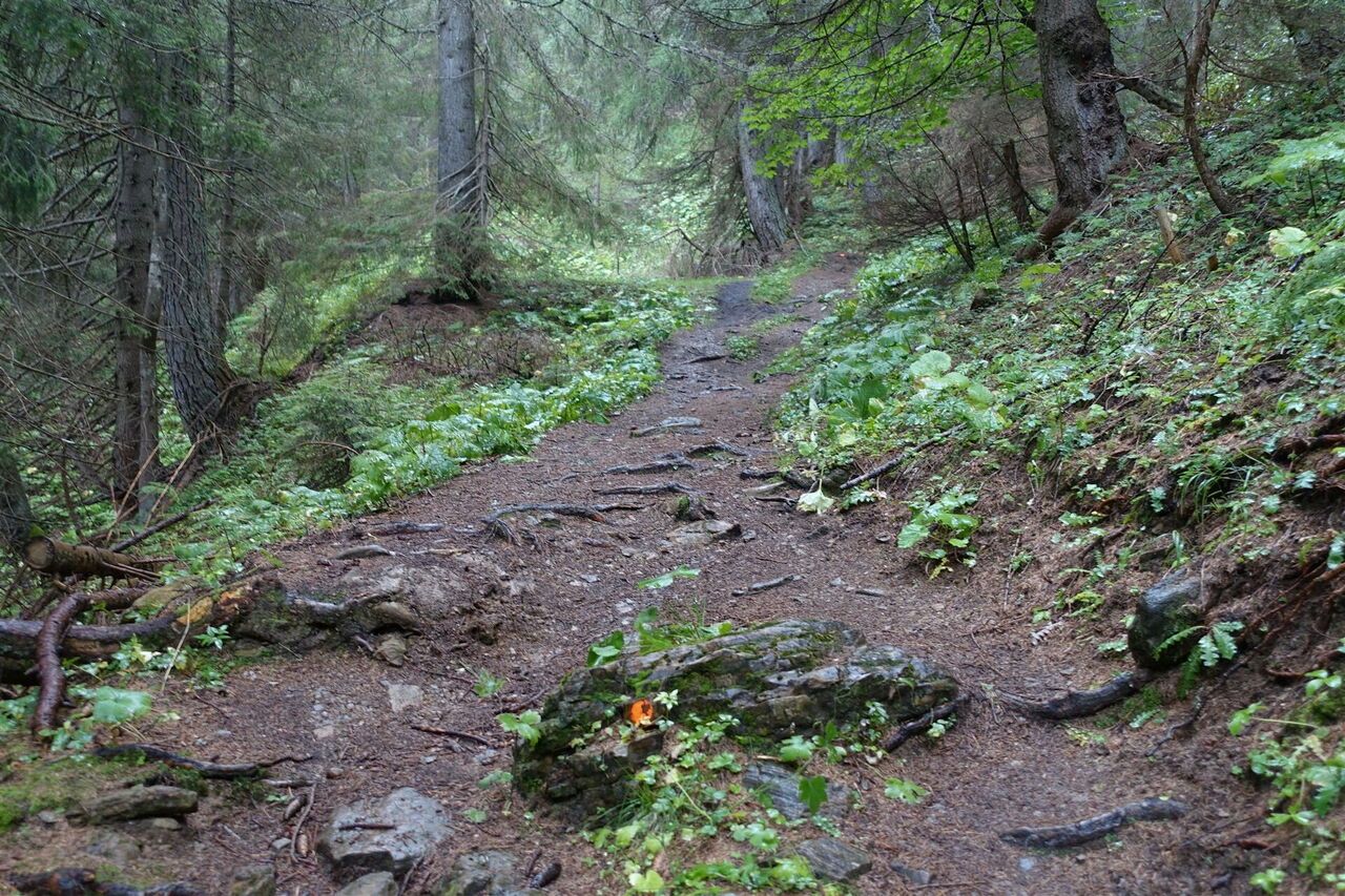 Wir ignorieren alle weiteren Abzweiger und erreichen die Einsattelung 03 Le Calades (1.858 m). Nach ca. 30–50 m Entfernung folgen wir dem linken Abzweiger Richtung Rifugio Bosconero und nicht dem weiterführenden Pfad Richtung Baita Darè Copàda und Spiz de San Piero. Zum Zeitpunkt der Recherchereise befanden sich dort kein Wegweiser und keine Wegnummer.