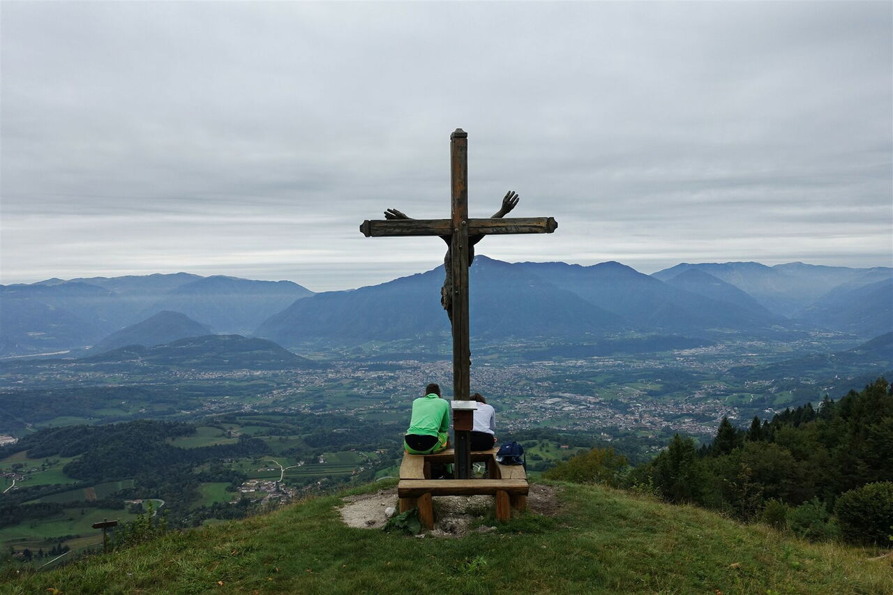 Die Hauptstraße am 01 Passo Croce d'Aune (1.011 m) verlassen wir in die Stichstraße links neben dem Albergo Croce d'Aune. Nach wenigen Metern kommen wir an dem Albergo Ristorante Al Camoscio vorbei. Am Ende der Straße gehen wir scharf rechts. Bei dem nachfolgenden Heiligenschrein verzweigt sich die Straße in drei Arme, wir gehen ganz rechts auf einem Schotterweg unterhalb von Häusern weiter. Eine scharf rechts abzweigende Piste ignorieren wir. Dort, wo der Wald lichter wird, verlassen wir den Schotterweg nach halb rechts und befinden uns nun auf einer Piste, die nach Pedavena Feltre ausgewiesen ist – der Wanderweg 801.