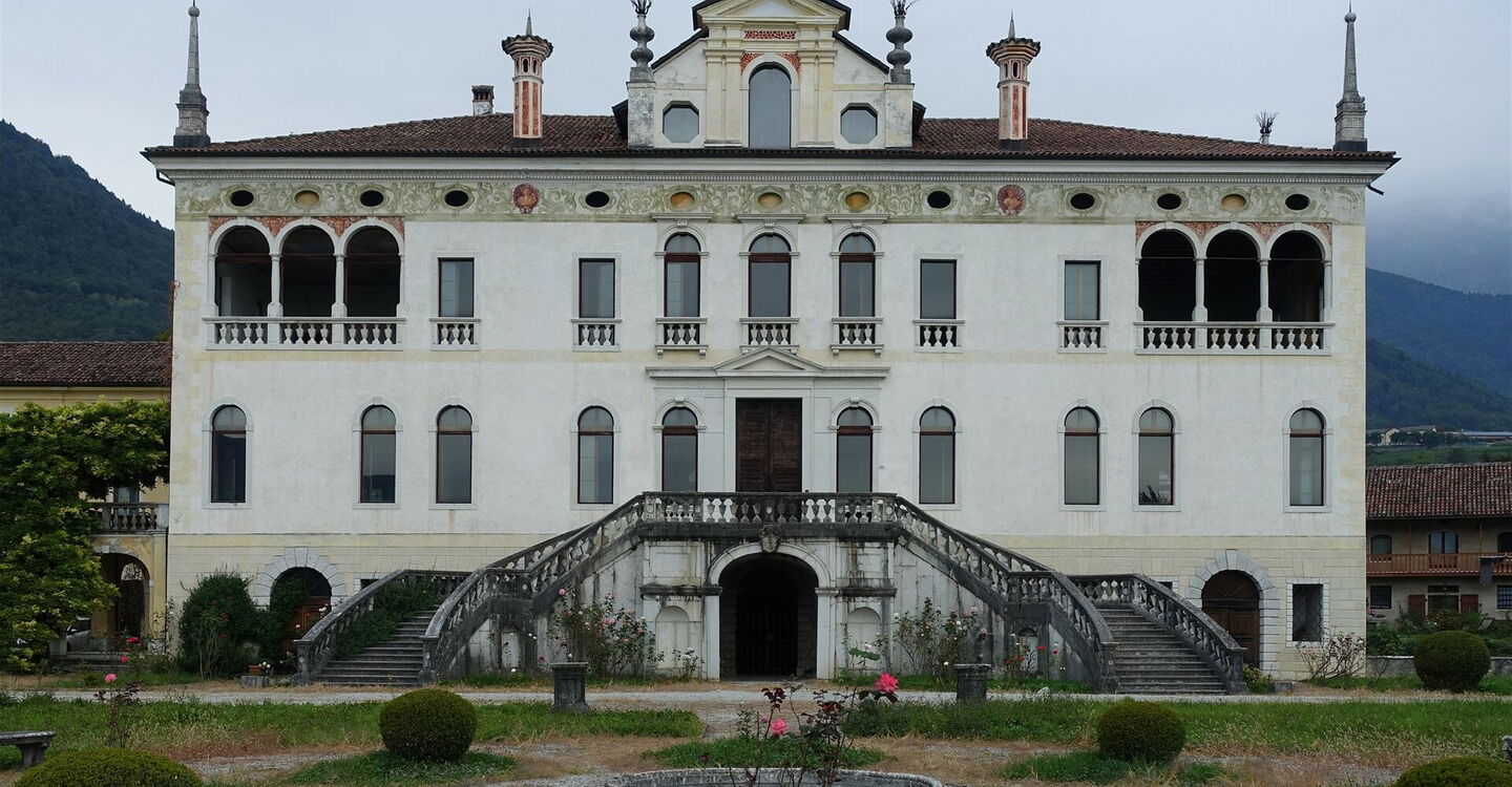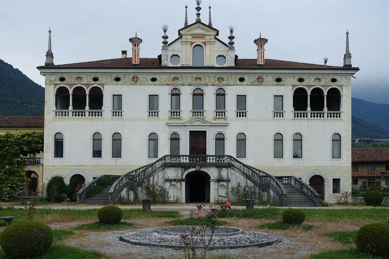Bei einer Leitplanke ignorieren wir zunächst die scharf nach links abzweigende Piste, aber bei einem Strommast gehen wir dann scharf links und nicht geradeaus weiter. Es folgt ein langer Wegabschnitt auf einer asphaltierten Straße, die an einer wunderschön gelegenen Kapelle vorbeiführt. In einer lang gezogenen Rechtskurve wandern wir durch ein Dorf. Kurz hinter der Pizzeria Alpina 1954 – genau bei dem gelben Haus der Casa Alpina San Marco – verlassen wir die Straße und wechseln auf den nach links abzweigenden Pfad. Nach ca. 110 m gehen wir dann scharf rechts auf der Asphaltstraße weiter, die kurz später in eine größere Straße mündet, auf der wir links bergab gehen. Bei dem Stoppschild gehen wir dann geradeaus weiter, auf dem Fußweg der Via Trento. An der Stelle, wo sich die Straße dann gabelt, gehen wir rechts an den beiden großen Thujen vorbei und gelangen zum dreistöckigen Gebäude der 02 Villa Pasole Berton (324 m), die nördlich von Feltre auf den Resten einer Festung erbaut wurde.