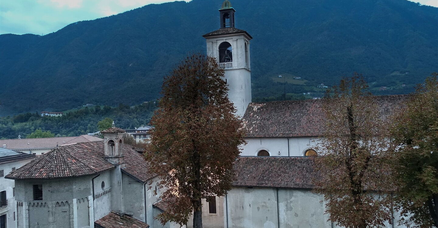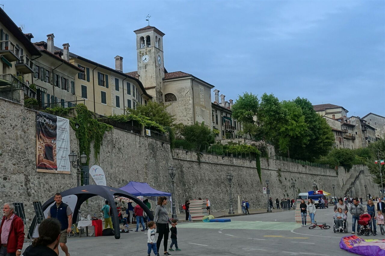 Auf dem Fußweg entlang der Hauptverkehrsstraße – die Zivilisation hat uns spätestens hier wieder eingeholt – gehen wir nun Richtung Ortszentrum. Weitere schöne Villen befinden sich rechts und links der Straße. An einer Kirche gabelt sich die Straße, wir gehen geradeaus auf der Viala Farra weiter. Hinter der ehemaligen Kaserne gehen wir direkt in die Einbahnstraße. Nachdem wir den Bachlauf überquert haben, spazieren wir unterhalb der Stadtmauern halb rechts durch eine Einkaufsstraße. Bei einer weiteren Straßengabelung blickt man halb links entlang der Stadtmauer aus dem 16. Jahrhundert bis zu der 04 Chiesa di San Giacomo Feltre (237 m).