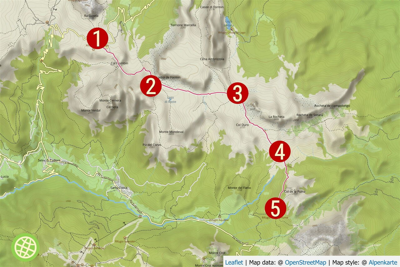 Unterhalb der Westhänge des Berges Col de la Puina wandern wir durch lichten Wald auf der Forststraße leicht bergab. Sobald wir unterhalb der Forststraße das 05 Rifugio Città di Fiume (1.918 m) sehen, steigen wir auf dem nachfolgenden Pfad zum Haus ab. Von der Hütte blickt man direkt auf die mächtigen Schutthalden der Nordwestflanke des 3.127 m hohen Monte Pelmo.