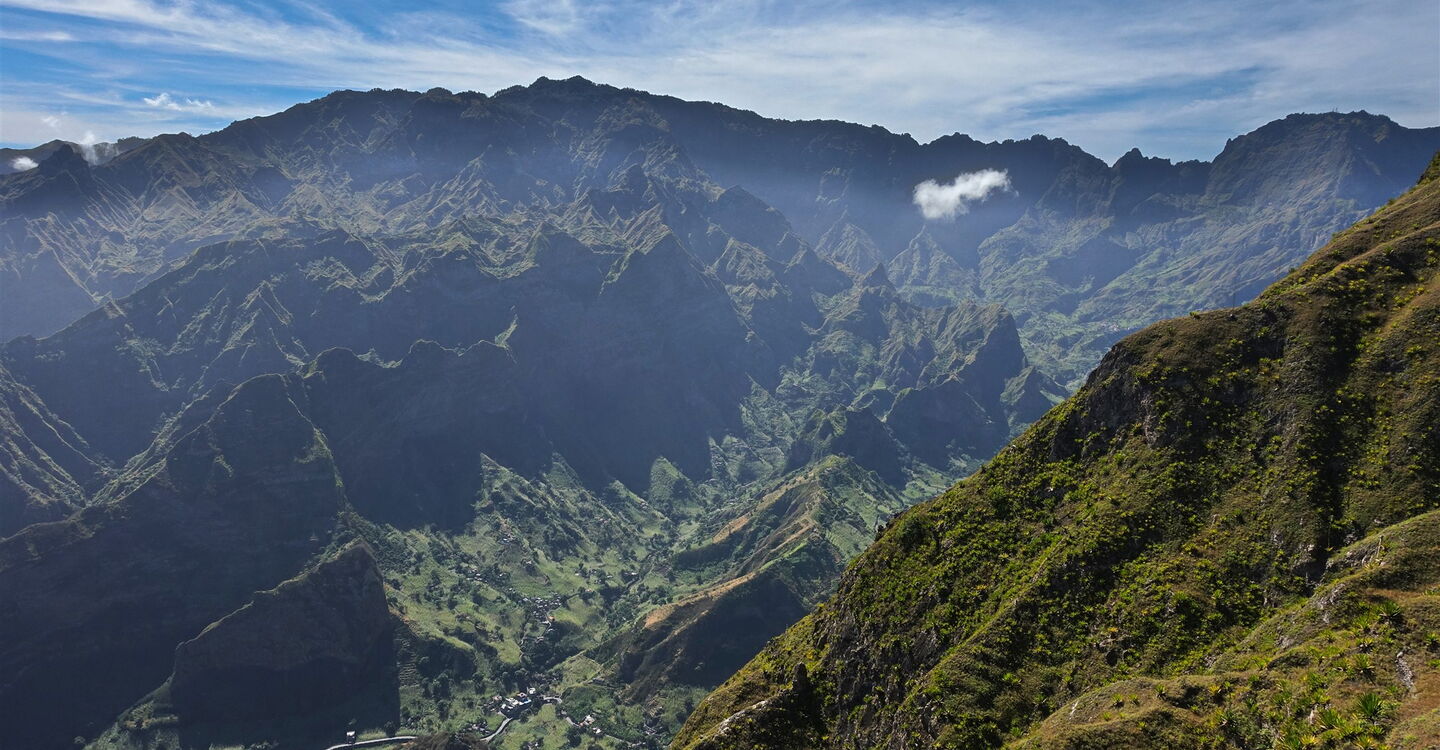 Aufgrund der einmaligen und atemberaubenden Blicke ins Tal und der Fernsicht entlang der Küste von Santo Antão, über das weite Rund des sattgrünen Figueiral de Paúl Tals bis zur bewaldeten Spitze des 1585 m hohen Pico da Cruz, gehört diese Tour zu den schönsten im Nordosten der Insel. Während sich im Tal Figueiral de Paúl das touristische Hauptgeschehen abspielt, wandern wir auf Routen fernab jeglichen Tourismus. Abschnittsweise führt der Pfad über einen ausgesetzten Grat eines Bergrückens, der bis zu 1000 Höhenmeter in den Talgrund abbricht. Man hat das Gefühl, man läuft auf einem Skywalk. Wir genießen Glücksmomente in luftiger Höhe.