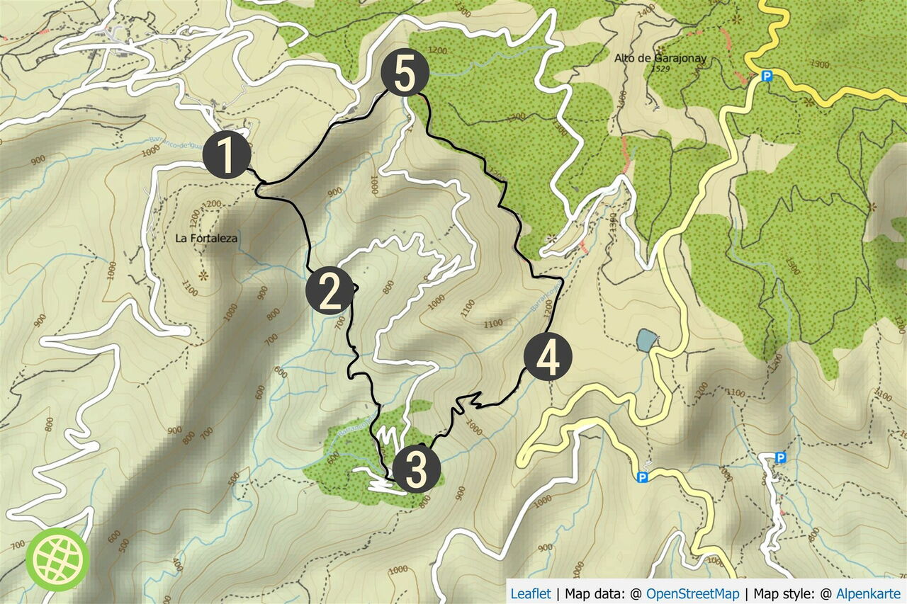 Vom (01) Start und Ziel Pavón (1091 m) gehen wir kurze 20 m auf der Straße Richtung La Dama, um links auf dem Weg Richtung Fortaleza de Chipude aufzusteigen. Die Straße geht schon bald in einen Pfad über und bei der folgenden Weggabelung gehen wir zunächst rechts, abermals Richtung Fortaleza de Chipude, um dann nach 40 m links - zwischen den beiden Zäunen hindurch - zum Eingang des Ferienhauses Casa Fortaleza zu gehen. Auf der linken Seite, vor dem hellroten Gatter, zweigt über eine Treppenstufe ein sehr unscheinbarer Weg ab - der im Laufe der Zeit schon stark zugewachsen ist. Auf dem ersten Teilstück ist kaum ein Weg auszumachen. Nach nur 200 m müssen wir eine Felsterrasse ca. 45 m nach rechts queren, um dann über einen kleinen Kamin auf die 5 m darunterliegende Felsstufe zu gelangen. Danach queren wir wieder nach links, bis wir einen Bergrücken erreichen, auf dem wir nun mittig bergab gehen. Ab hier können wir einen Pfad ausmachen und vereinzelte Steinmännchen helfen bei der Orientierung.