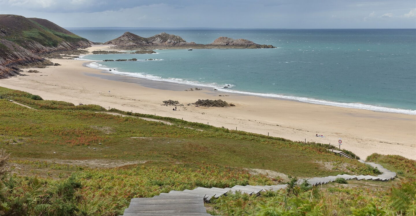 Nach kurzem Fußmarsch sehen wir unterhalb den bei Ebbe 900 m langen 03 Plage de Lourtuais (40 m) – ein wahrer Traumstrand, besonders schön ist er am westlichen Ende, wo ein kleines Kap Schutz vor dem Nordwestwind bietet. Wir gehen auf dem rechts bergab führenden Treppenweg zunächst Richtung Strand, um dann aber direkt vor dem Strand links auf einem Weg oberhalb der Dünen zu wandern. Bei dem nachfolgenden zweiten Zugang zum Strand beginnen wir links auf dem weiterführenden Pfad aufzusteigen. Auf dem breit angelegten Weg gehen wir weiter, bis rechts ein mit Holzbalken befestigter Pfad abzweigt.