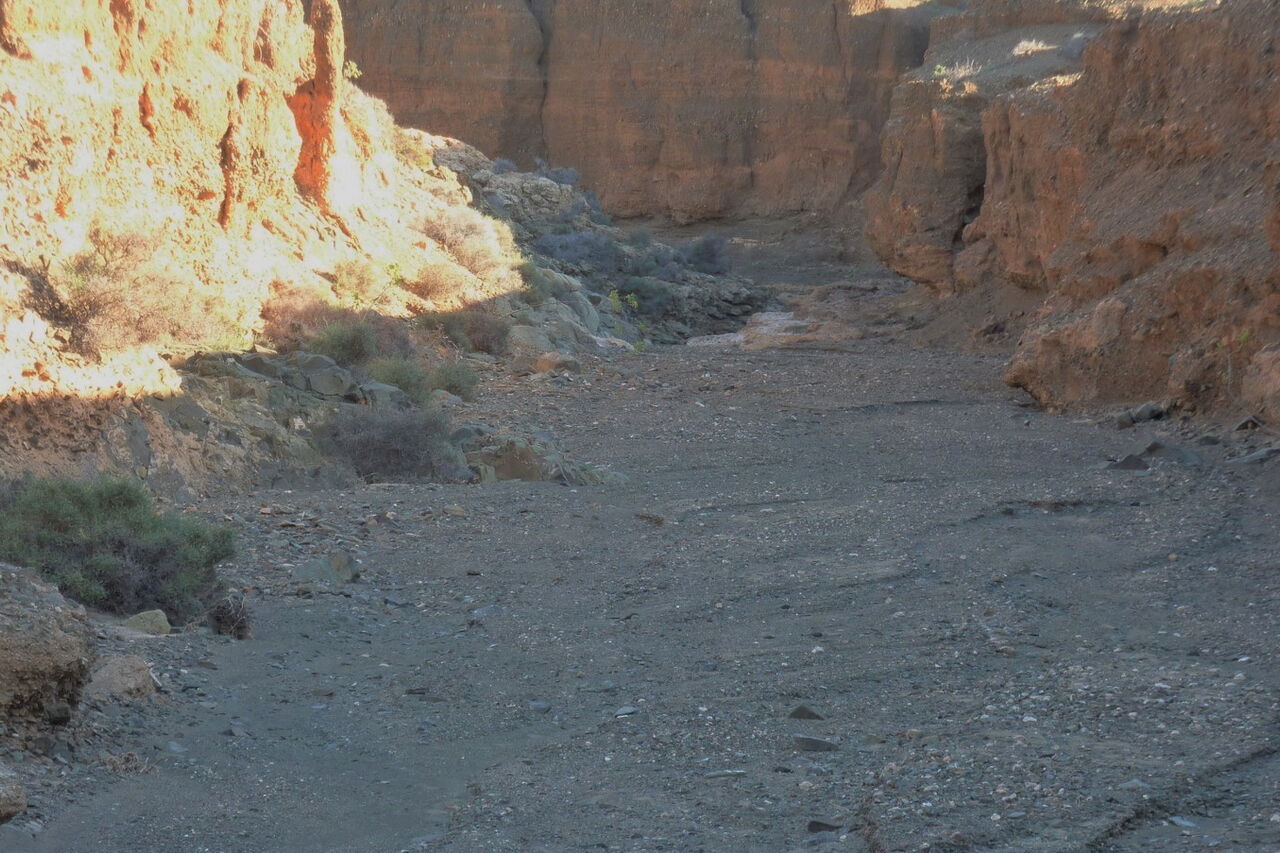 Im Barranco angekommen, ist die Orientierung sehr einfach. Wir folgen dem nicht vorhandenen Wasserstrom, der den Gesetzen der Schwerkraft folgt und sich Richtung des Atlantischen Ozeans bewegt. Immer weitere Zuflüsse von rechts und links vereinigen sich zu einem immer breiter werdenden Trockenfluss. Im weiteren Verlauf unterqueren wir eine gesperrte Straße im militärischen Sicherheitsbereich.