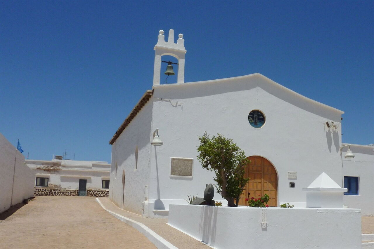 Nach 50 m führt der Weg halb rechts an dem mittig in der Straße stehenden Haus vorbei. Wir treffen auf die schlicht gehaltene weiße Dorfkirche 02 La Virgen del Mar 3 m mit ihrem minimalistischen Glockenturm. Im Inneren der Kirche gibt es eine Besonderheit, ein Taufbecken aus einem Schildkrötenpanzer. Wir befinden uns nun auf der Calle Gracia Escámez und gehen in nordöstlicher Richtung, bis wir uns bei einem kleinen Platz mit Palmen halb rechts halten und in die Calle el Bajio einbiegen. Am Ende der Straße gehen wir direkt auf ein Gebäude zu, an dem wir uns links halten, um direkt ans Meer zu gelangen.