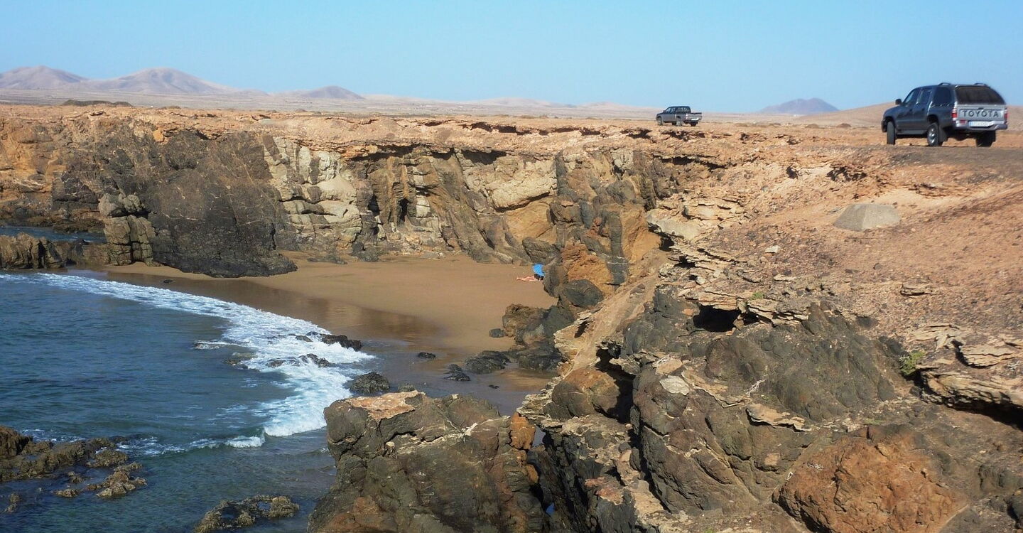 Der Start ist mit öffentlichen Verkehrsmitteln nicht erreichbar. Mit dem Pkw fährt man 18 km von Puerto del Rosario auf der FV-10 Richtung Tindaya, um dann bei der kleinen Verkehrsinsel links, gefolgt von einer Rechtskurve, in den Ort Tindaya zu fahren. Nach 1 km fahren wir bei der nächsten Verkehrsinsel links, vorbei an der rechts von uns liegenden Kirche. Bei der unscheinbaren Bar links auf der Ecke, links vorgelagert sind einige Parkplätze, fahren wir halb rechts weiter auf der Hauptstraße. Nach 150 m biegen wir vor der großen Verkehrsinsel in die Calle Los Reyes ein. Wir ignorieren alle Abzweiger links und rechts, bis die Straße endet. Hier fahren wir nur einige Meter links, um dann sofort rechts auf die beginnende Schotterpiste abzubiegen. Nach 3,3 km auf der Schotterpiste lassen wir den Abzweiger rechts zum Playa Tebeto liegen und fahren noch exakt 1,3 km, bis rechts ein unscheinbarer Schotterpfad abzweigt. Nach 200 m erreichen wir die Klippe direkt oberhalb des Strandabschnitts.