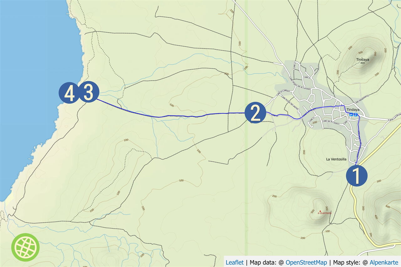 Holprige Anfahrt von Tindaya. Nachdem wir das Auto geparkt haben, liegt nur ein kurzer Abstieg vor uns. Art des Weges: Mit dem Pkw gelangen wir auf einer Schotterpiste zum Ausgangspunkt der Wanderung, die uns über einen schmalen Schotterpfad führt. Empfehlung an die Ausrüstung: Verpflegung für einen Tagesausflug. Es empfiehlt sich die Einkehr in das Fischrestaurant La Marisma in El Cotillo. Diese Tour kann man das ganze Jahr über machen. Interessantes: Informationszentrum Casa Alta in Tindaya.