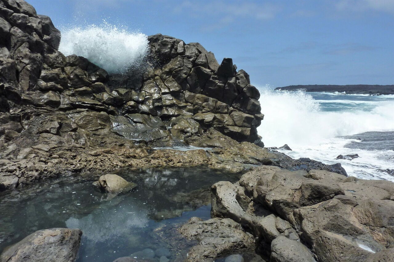 Es erwartet uns eine spannende Pkw-Fahrt durch eine lebensunfreundliche Lavalandschaft, gefolgt von einer erlebnisreichen Wanderung zu einem Traumstrand. Art des Weges: Anfahrt auf einer Schotterpiste. Die kurze Wanderung geht über Sand und Felsen. Ein Strand, der zum Verweilen einlädt! Daher sollte folgende Ausrüstung nicht fehlen: Sonnenhut, Sonnencreme, Sonnensegel, Essen und Trinken. Einkehr: Es gibt weit und breit keine Einkehrmöglichkeit. Beste Zeit für diese Tour: Das ganze Jahr über. Auf der linken Seite des Strandabschnitts erhebt sich eine 5-7 m hohe Felswand, an der sich die Wellen spektakulär brechen. Direkt vorgelagert befindet sich ein natürliches Wasserbecken, in dem man sich abkühlen kann.