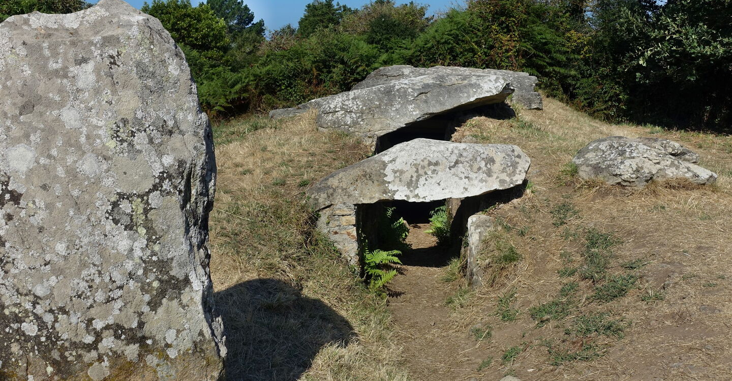 Sobald wir eine Asphaltstraße erreichen, befindet sich rechts nach 125 m der 05 Dolmen de Lannek-er-Men (21 m). Dolmen ist in Frankreich der Oberbegriff für Megalithanlagen aller Art. Der kleine von Osten nach Westen orientierte, 4 m lange und 1,5 m breite Dolmen mit einem Zugang im Osten besteht aus zwölf Steinen, von denen sechs seitliche die beiden Decksteine stützen und ein Stein neben der Anlage liegt. Wir gehen die 125 m zurück und an der Kreuzung geradeaus, links befindet sich der Hinweg. Bei der weithin sichtbaren Kirche befindet sich der Parkplatz.